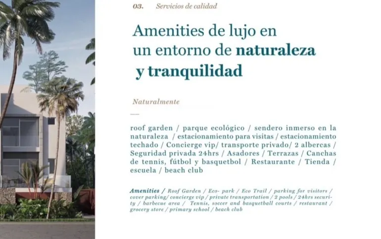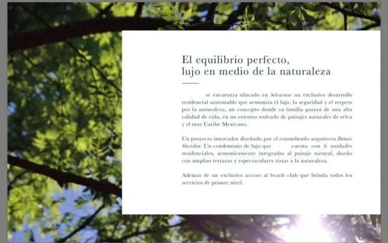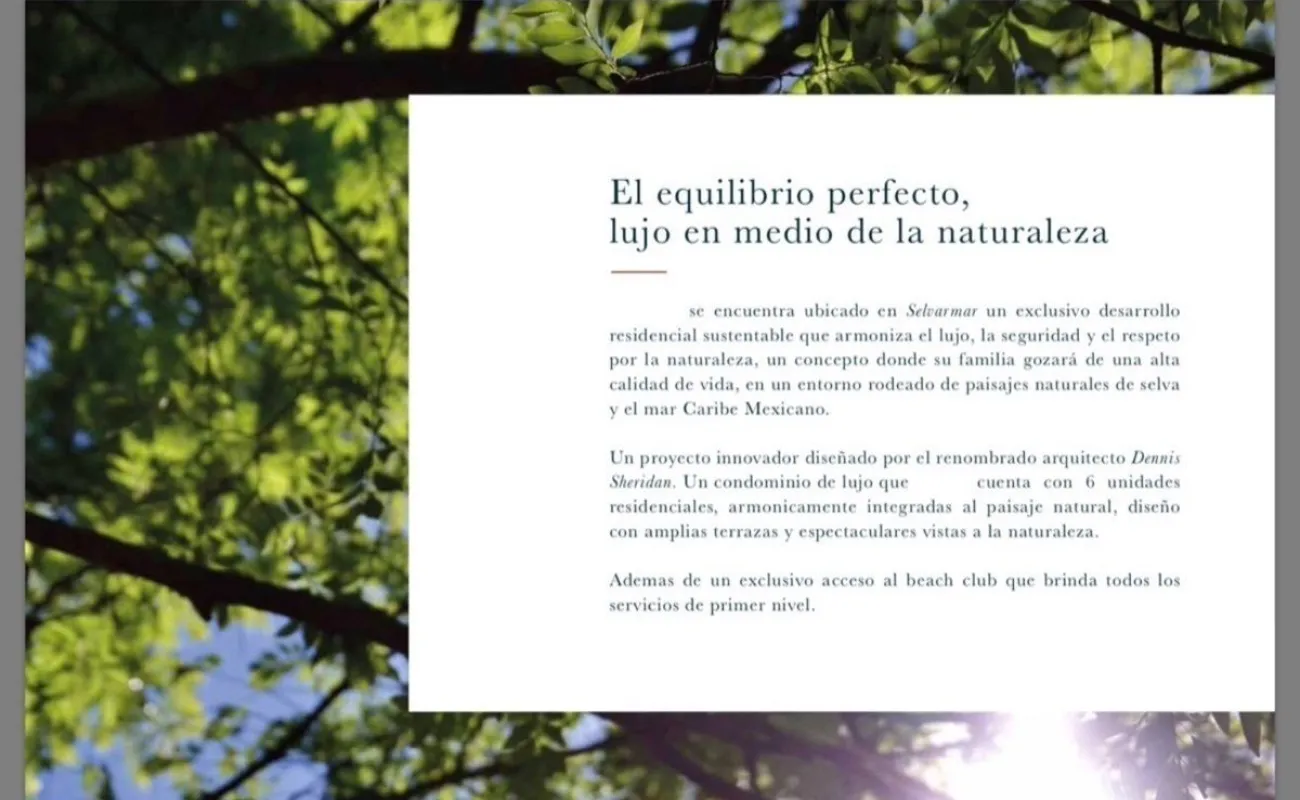 Condominio de lujo que cuenta con 6 unidades residenciales, armónicamente integradas al paisaje natural, diseño con amplias terrazas y espectaculares vistas a la naturaleza, ubicado en Selvarmar, un exclusivo desarrollo residencial sustentable donde el lujo, la seguridad y el respeto por la naturaleza se encuentran en perfecta armonía, concepto donde la familia gozará de una alta calidad de vida, en un entorno rodeado de paisajes naturales de selva y el mar Caribe Mexicano.