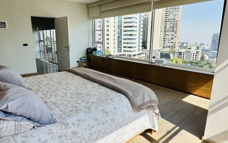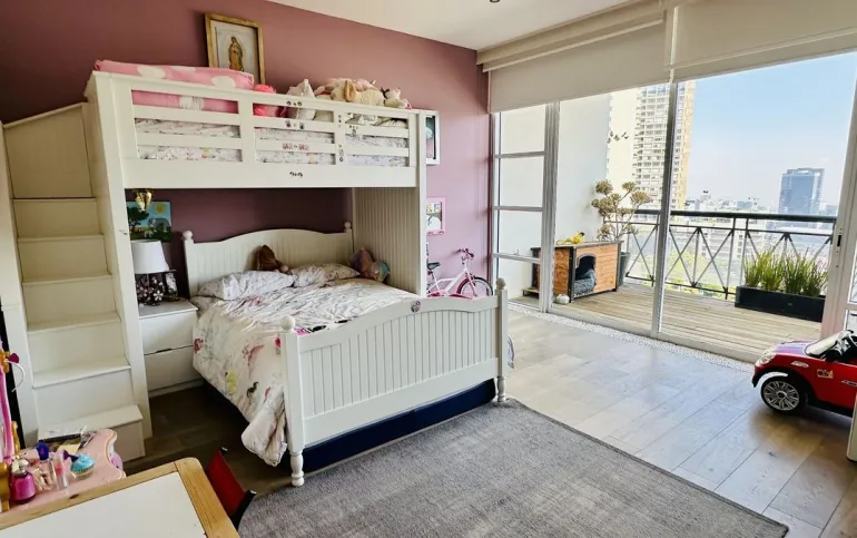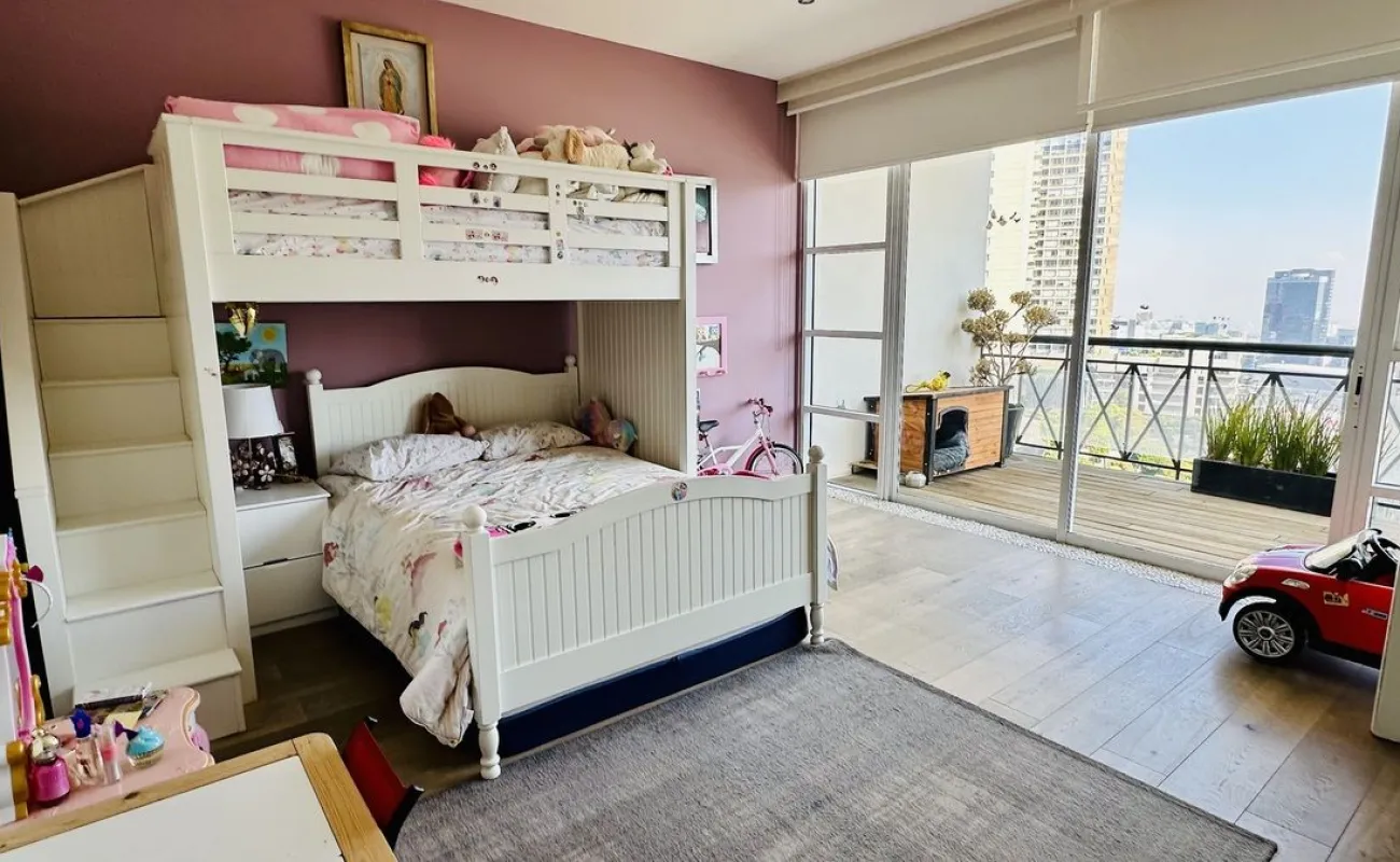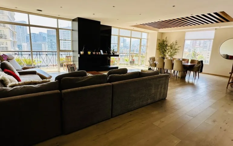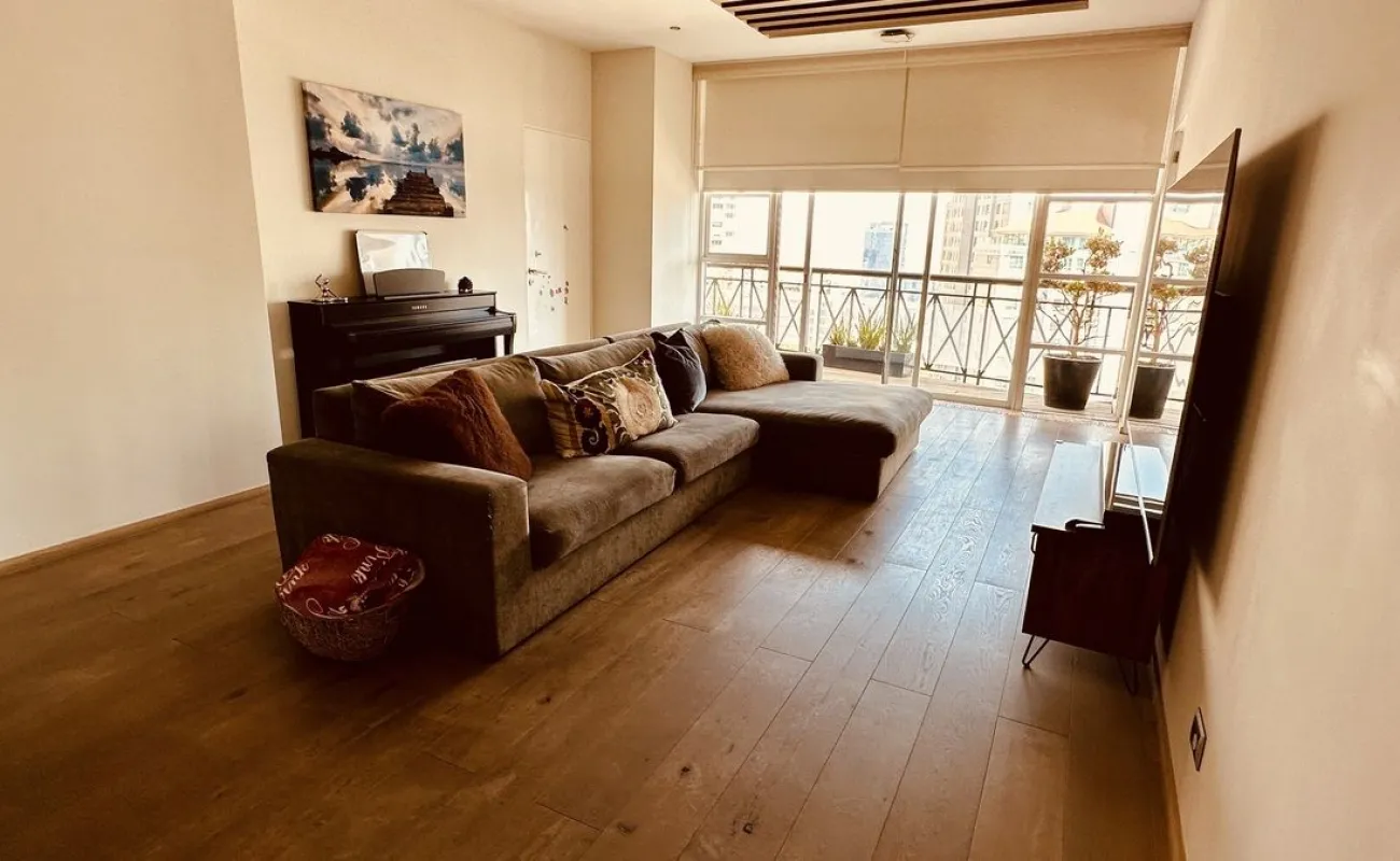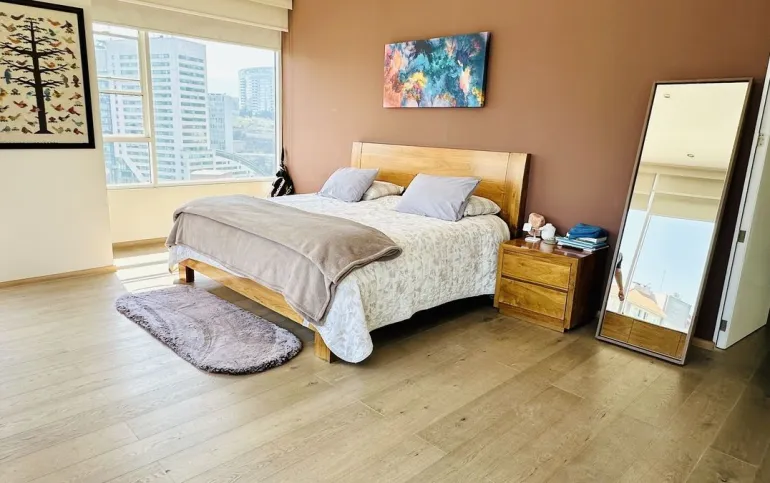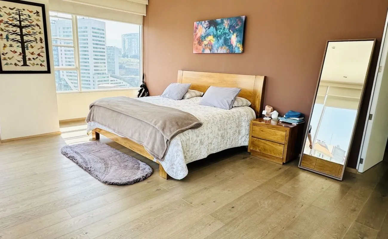 Vive con lujo, confort y una ubicación inmejorable en este espectacular departamento, completamente remodelado y actualizado, ubicado frente al Centro Comercial Santa Fe. El departamento cuenta con 3 recamaras cada una con vestidor y baño completo, una de las secundarias con acceso a terraza; family room de buen tamaño con salida a terraza; espacio de sala y comedor muy amplio con acceso a terraza principal; cocina abierta integral y equipada; medio baño de visitas; cuarto de servicio y área de lavandería; 3 lugares de estacionamiento y bodega; el elevador es directo al departamento. Todo el departamento cuenta con excelente iluminación natural, grandes espacios y acabados de lujo.