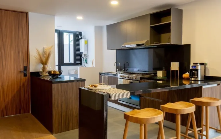 Disfruta de la serenidad y el espacio de la terraza de cuarenta y siete metros cuadrados, perfecta para relajarte y disfrutar del aire libre sin salir de casa. Además, cuenta con una cocina equipada que te invita a explorar tu creatividad culinaria, y un área de lavado y closet integrado para mantener todo en orden.