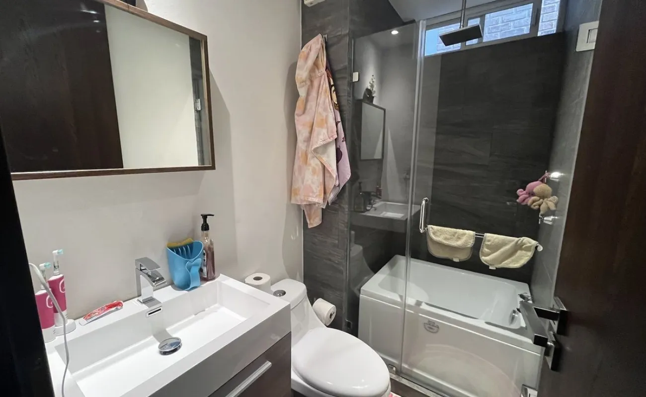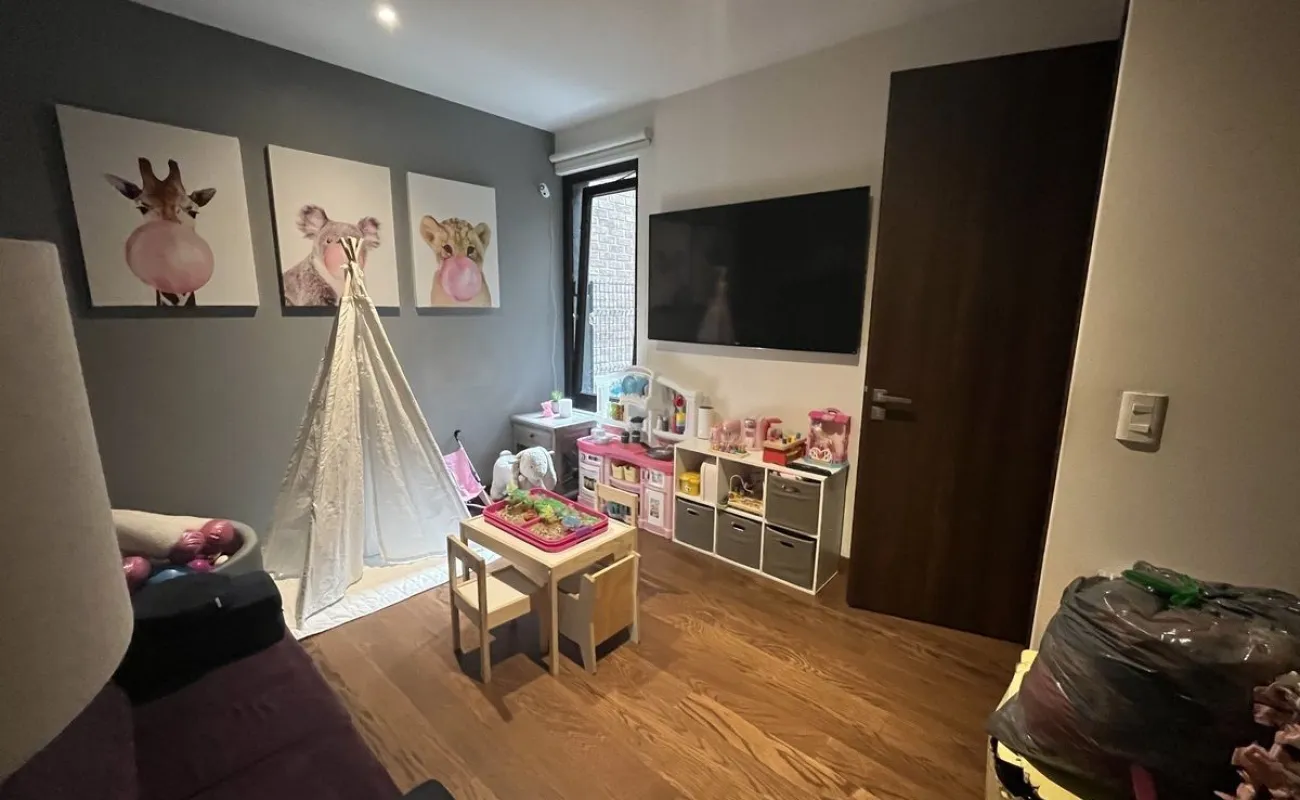 Y como amenidades un gran jardín común, salón de usos múltiples, ludoteca, gimnasio y sky bar (salón de adultos con barra, tele, sala, mesas y jacuzzi ). Hay lugares de estacionamiento para visitas.