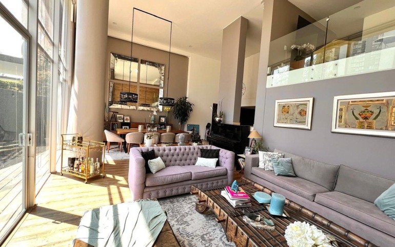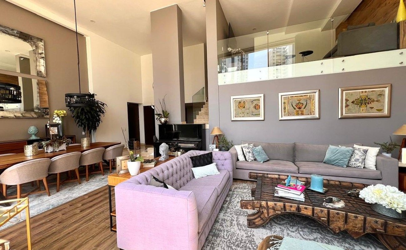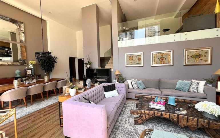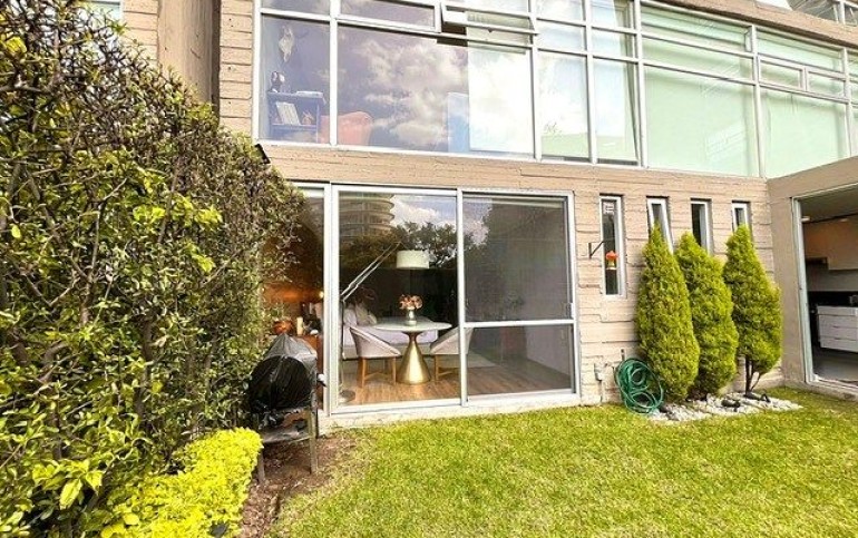 Cuenta con 315 m² de construcción, 60 m² de jardín y 30 m² de terraza. Área social con doble altura en sala, comedor y recibidor; sala con chimenea y salida a la terraza. Medio baño de visitas.