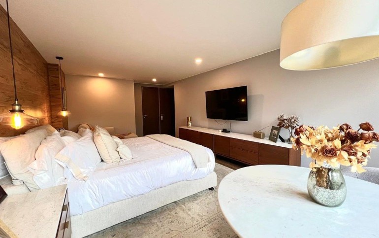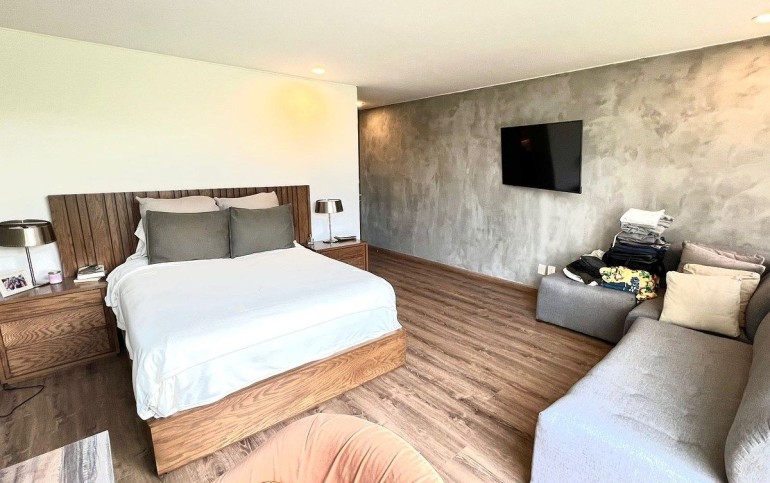 Dispone de 3 recámaras, cada una con baño completo y vestidor. La recámara principal se ubica en el primer nivel con salida al jardín; recámaras secundarias en el segundo nivel. Incluye family room, cocina amplia, desayunador o antecomedor con salida al jardín, cuarto de lavado y cuarto de servicio con baño completo.