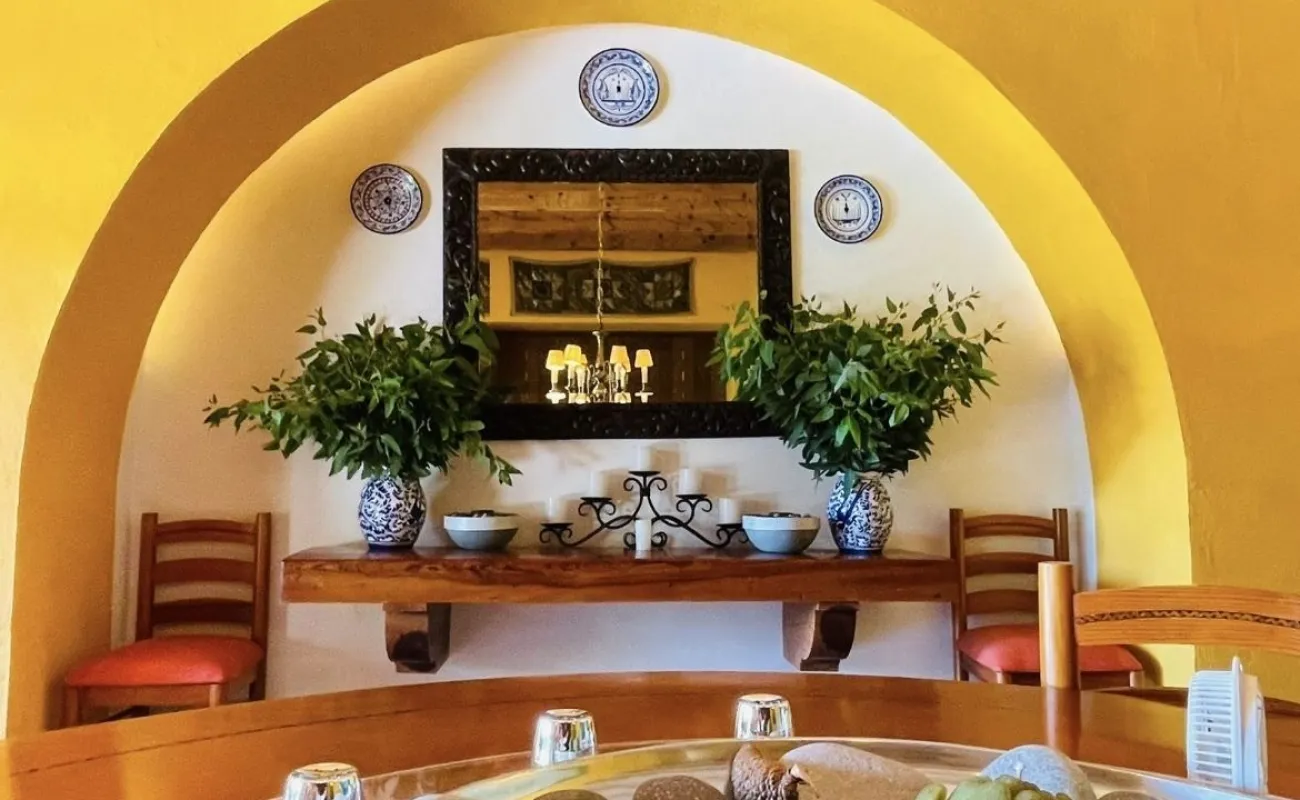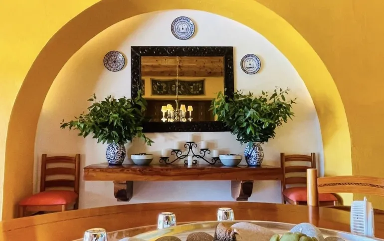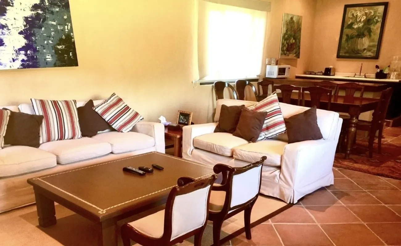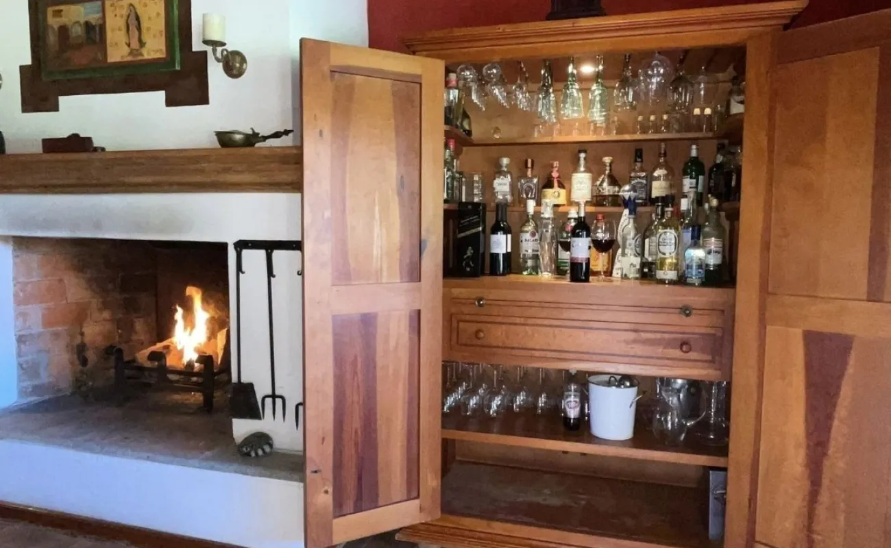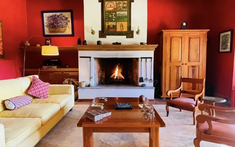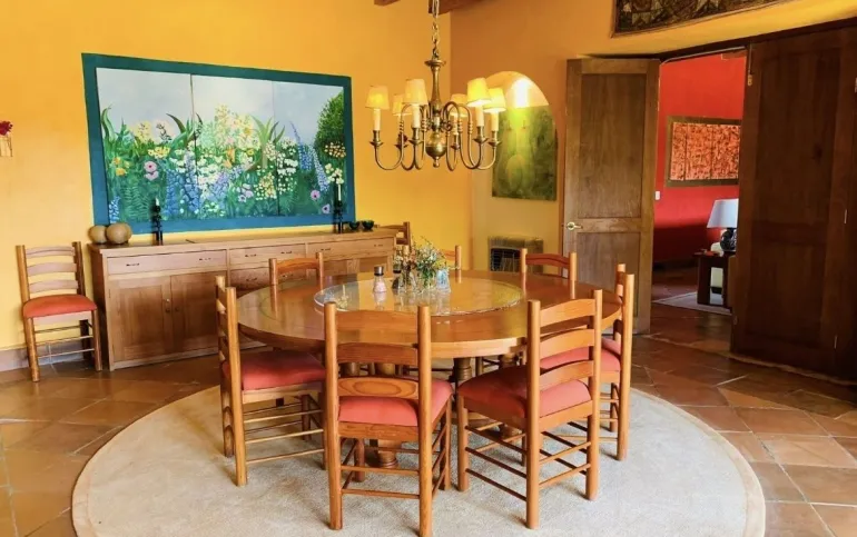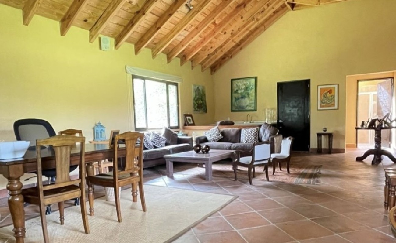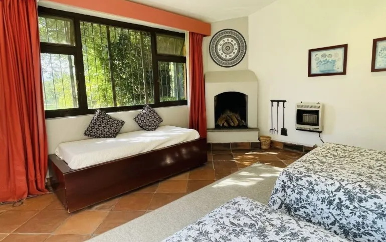 La casa principal cuenta con sala con gran chimenea y comedor para 12 personas, cocina integral, dos amplias recamaras, la principal con walk in closet, baño y tina. La segunda recámara también tiene walk in closet, baño completo y chimenea.