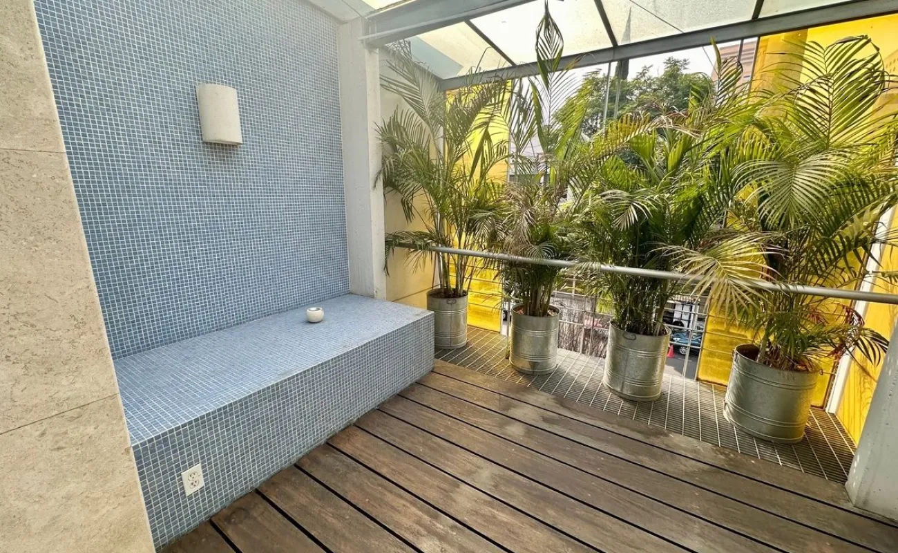 Piso 1. Sala, comedor y cocina semiabierta. El comedor con balcón y la sala con un patio con plantas, enredadera y palmera.