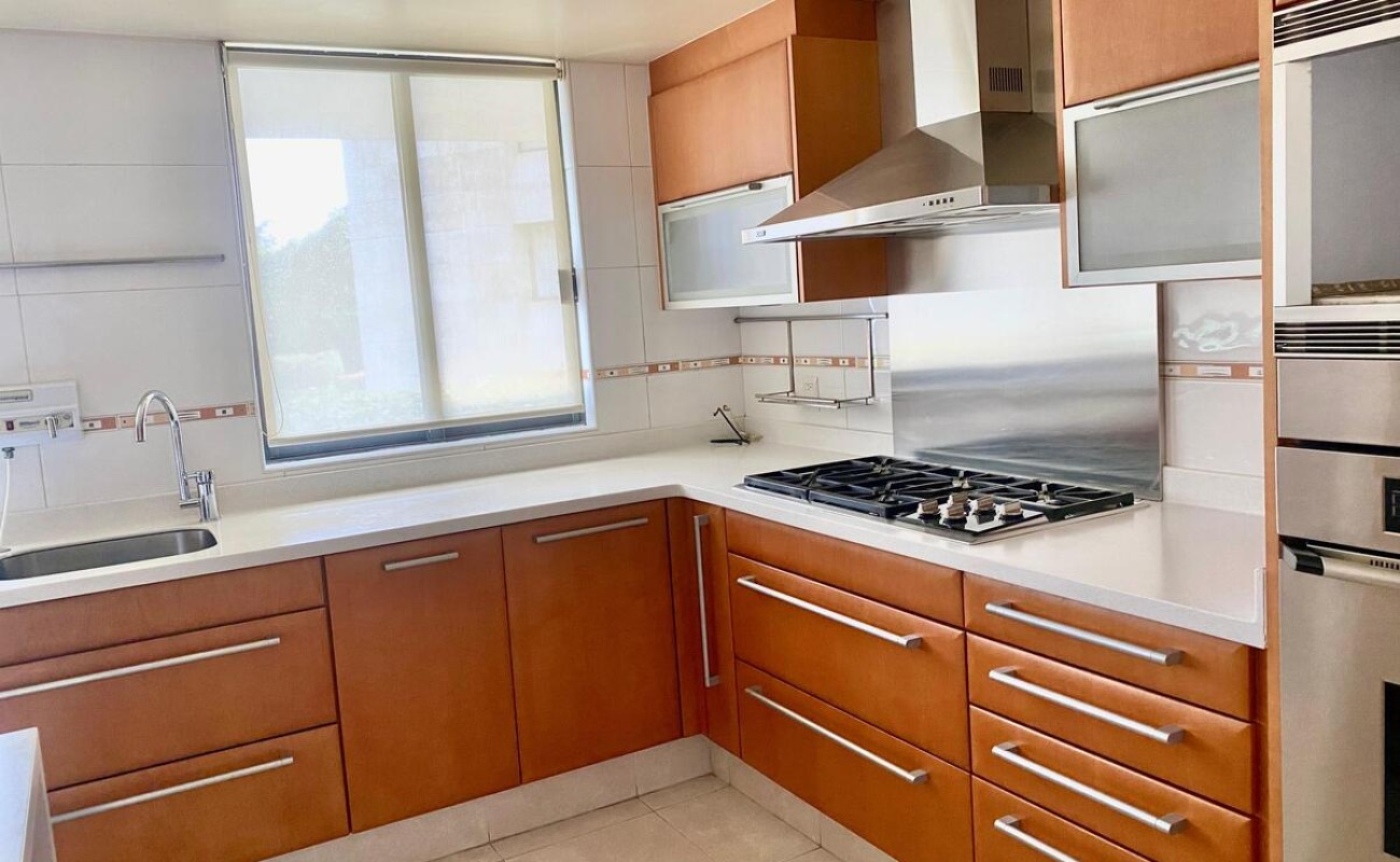 En nivel inferior: family room, medio baño, cuarto de servicio independiente con su baño, hermoso jardín posterior; en nivel intermedio: amplia sala y comedor, cocina integral con cubierta y barra de mármol travertino, gran alacena, cuarto de lavado, medio baño de visitas, garaje para 4 autos, vestíbulo; Nivel superior: 3 recámaras, cada una con su baño, dos con vestidor y una con closet, una con aire acondicionado y cuarto de TV.