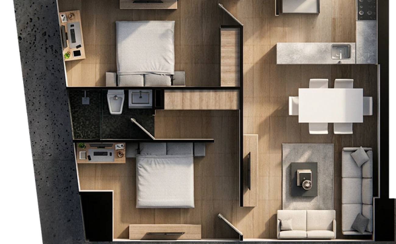 Departamentos de 2 y 3 recámaras diseñados para ofrecer confort, funcionalidad y una experiencia de vida contemporánea.