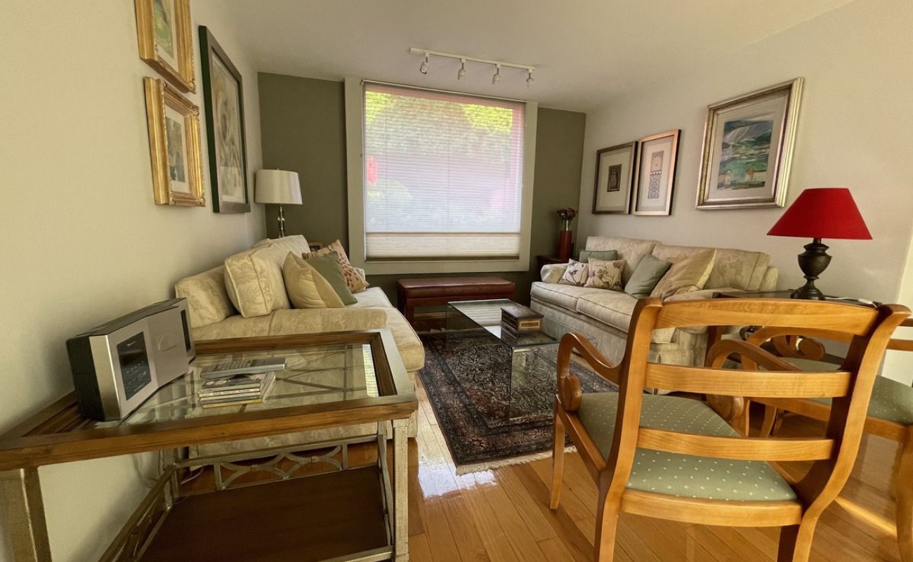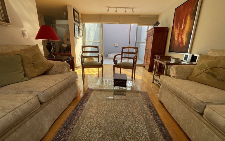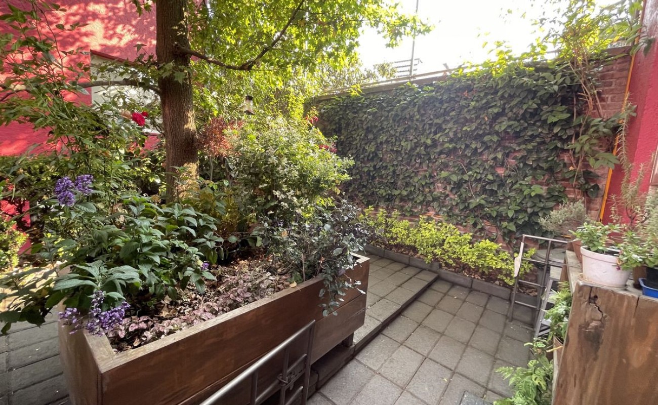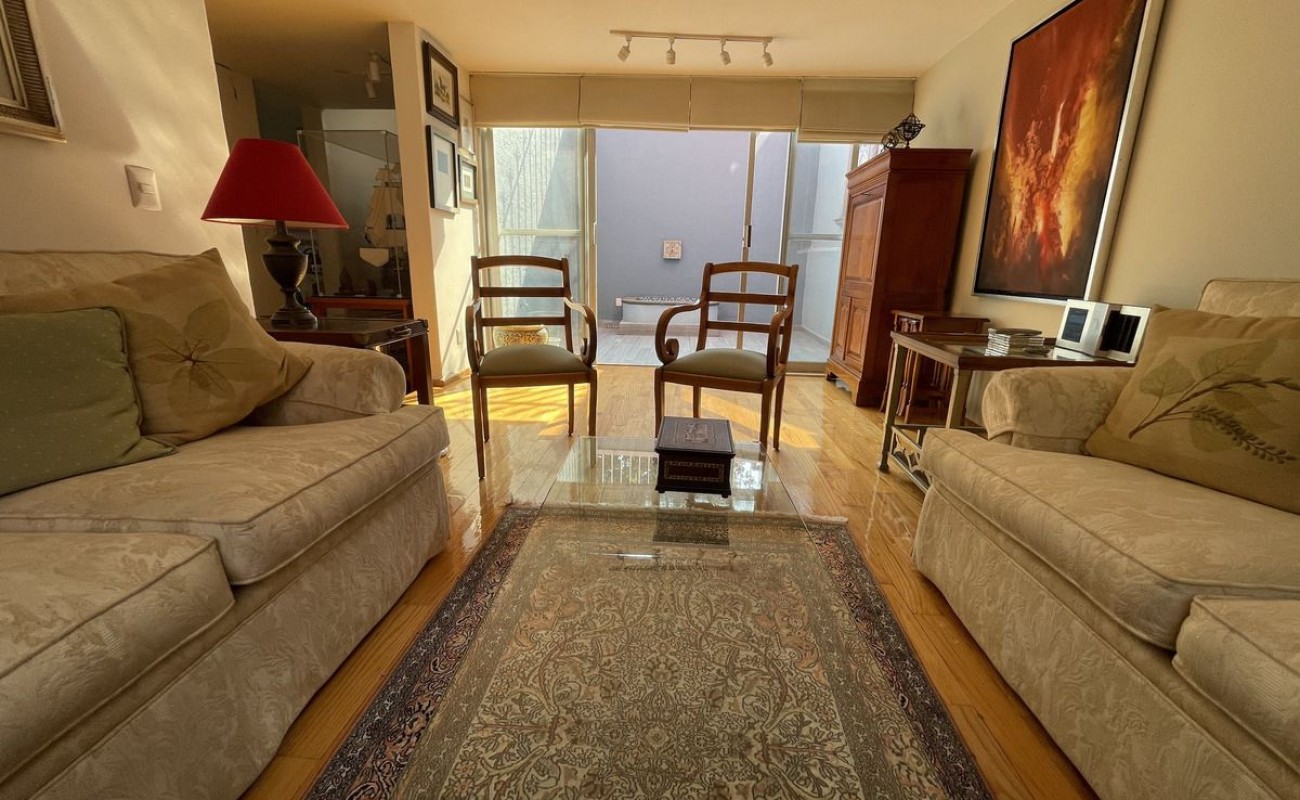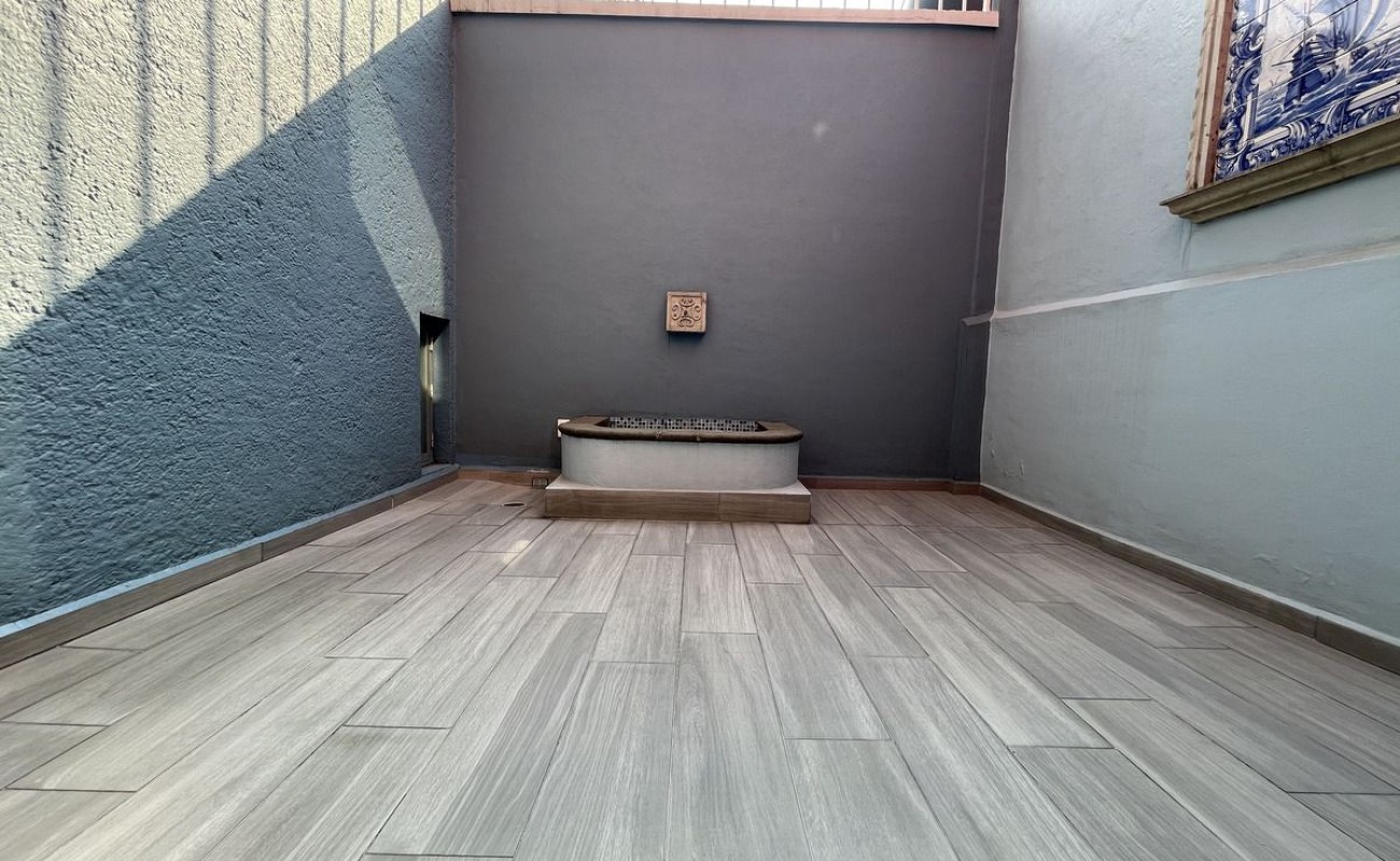 Sala con acceso a una de estas terrazas con pequeña fuente.