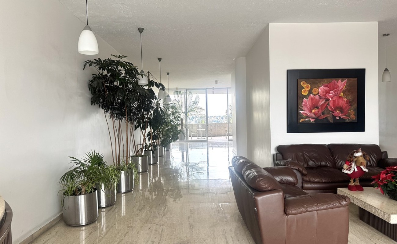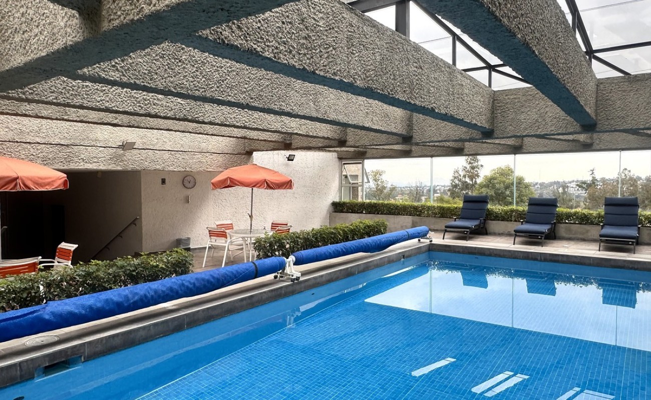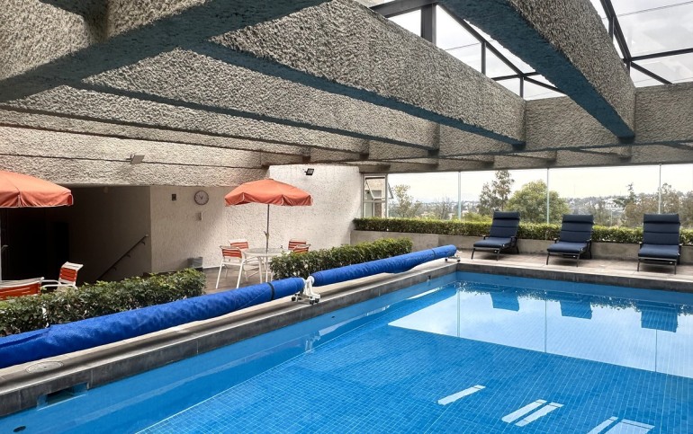 Edificio con amenidades: alberca techada, jacuzzi, salón de fiestas.