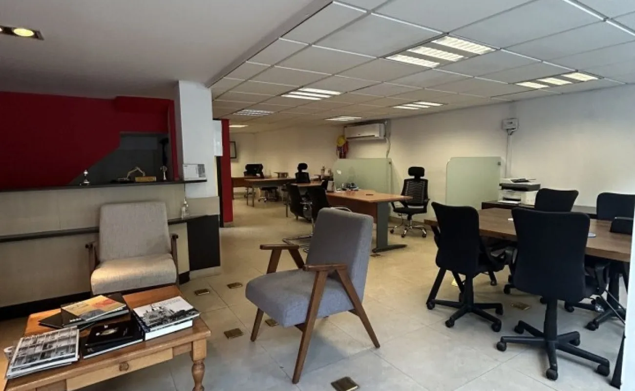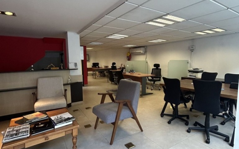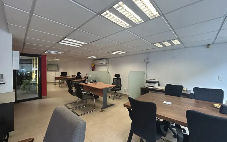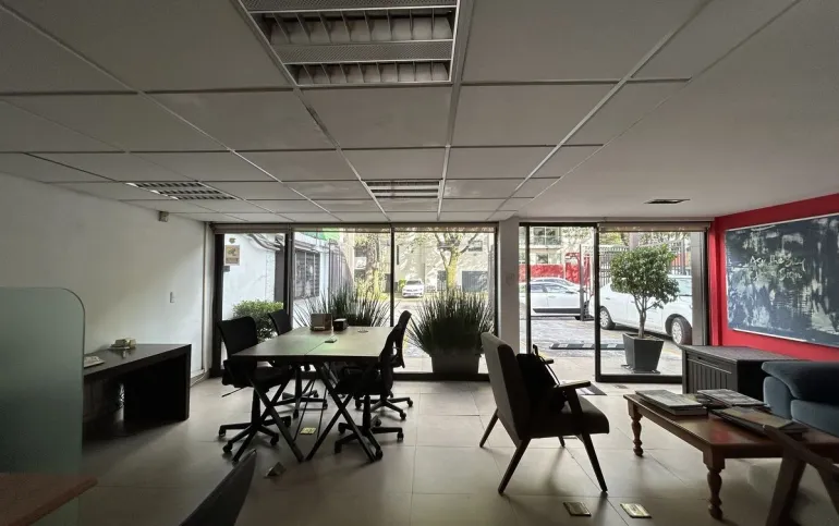 Tiene 80m2 de espacio abierto, medio baño con posibilidad de hacer uno adicional y dividirlos, y site (este espacio en el piso 1), 35m2 de dos estacionamientos exclusivos de la oficina/local y bodega de 4m2 (es la casita de las fotos).