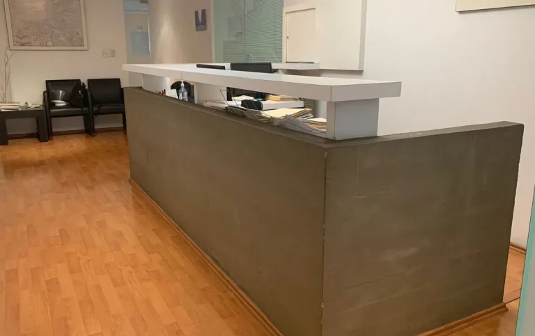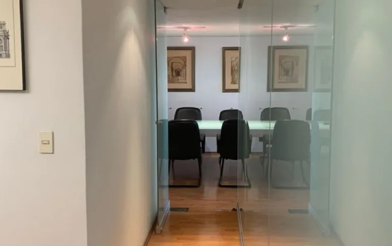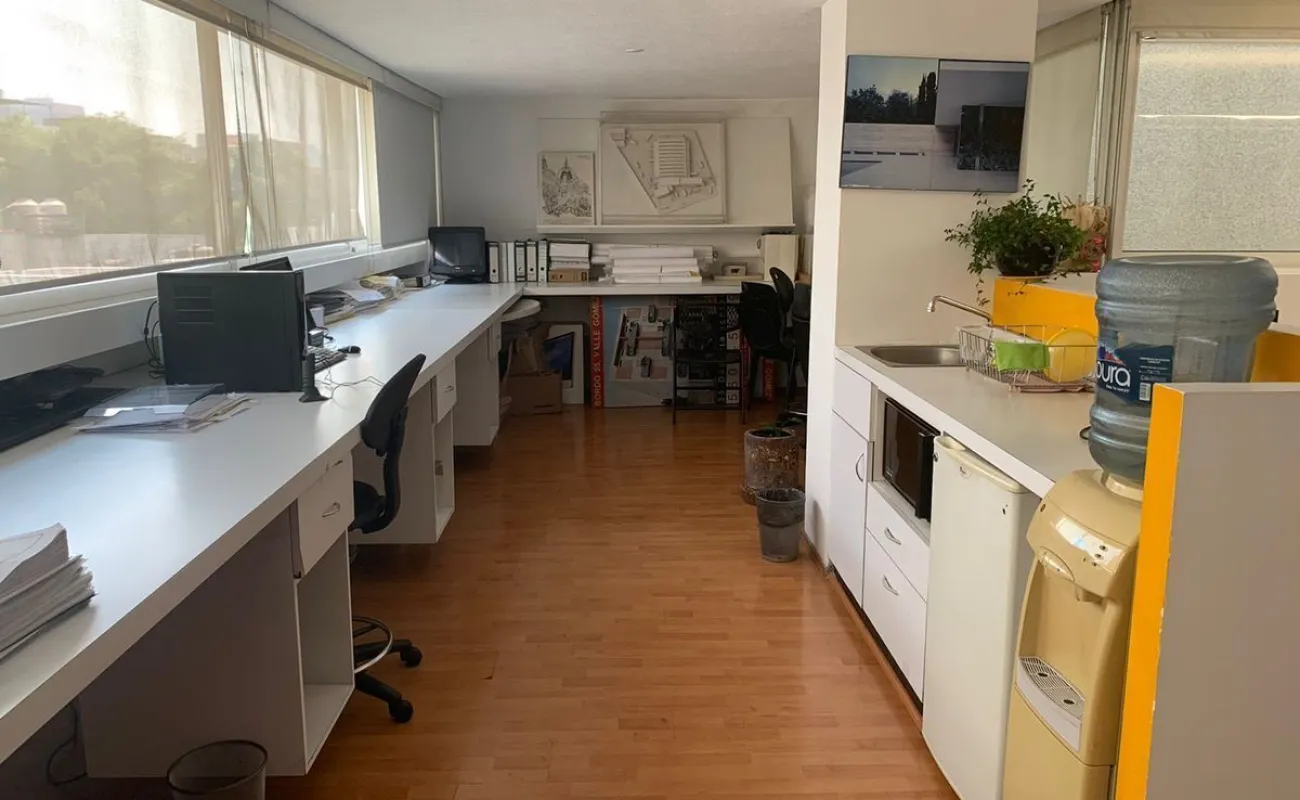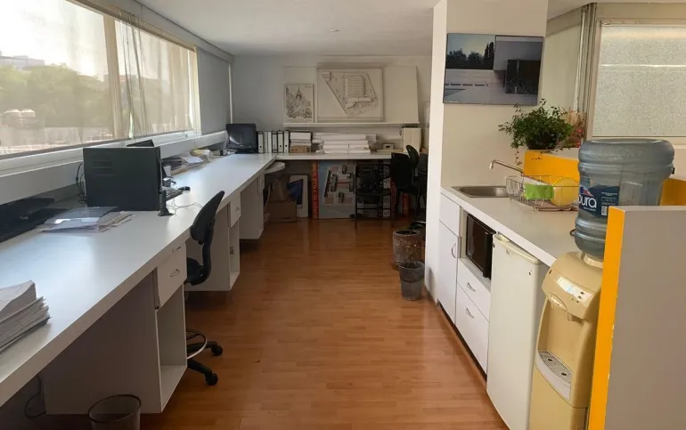 Excelente estado, se ubica en tercer piso. Cuenta con recepción, oficina, baño, sala de juntas para 8 personas, dos estacionamientos techados, amplio, independiente, cisterna, baño común para hombres y mujeres. Vigilancia 8 horas y conserje, cámaras de vigilancia, puerta eléctrica, elevador.