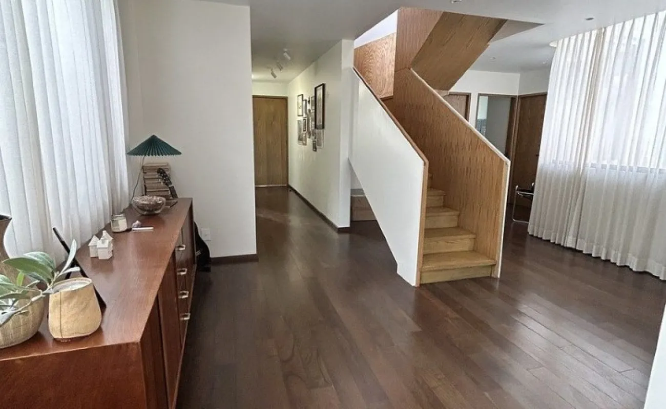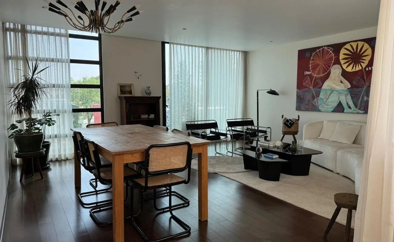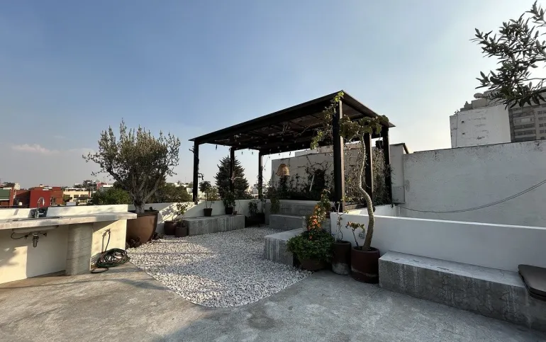 Está amueblado y equipado. Tiene 3 recámaras, 2.5 baños, 2 estacionamientos y rooftop privado con árboles frutales y family room.