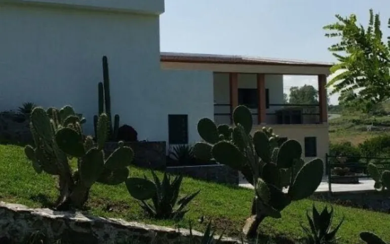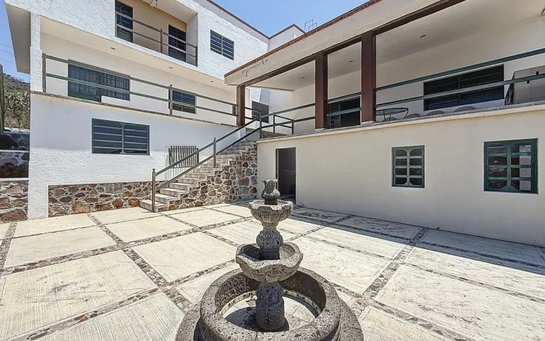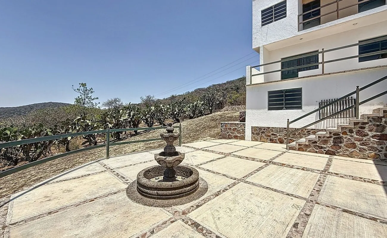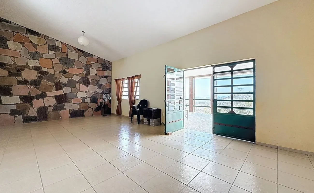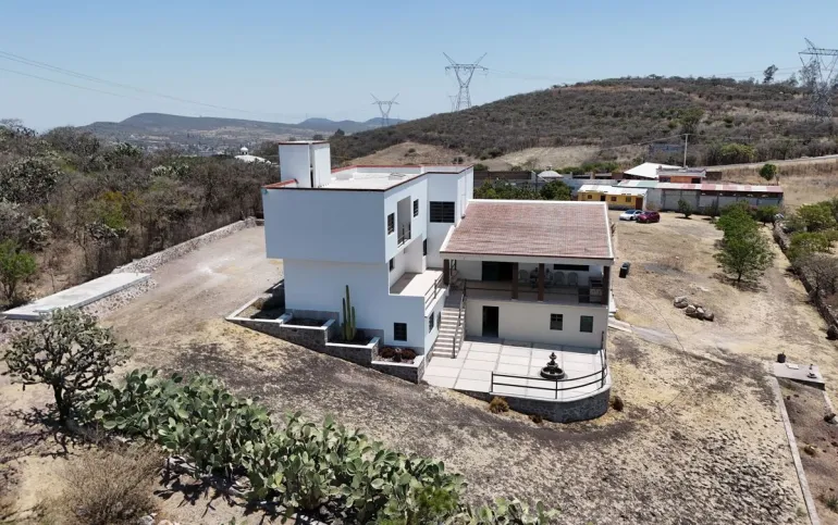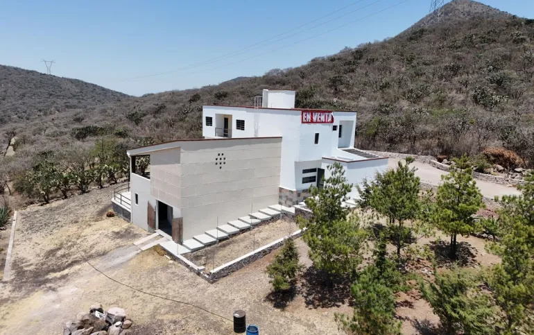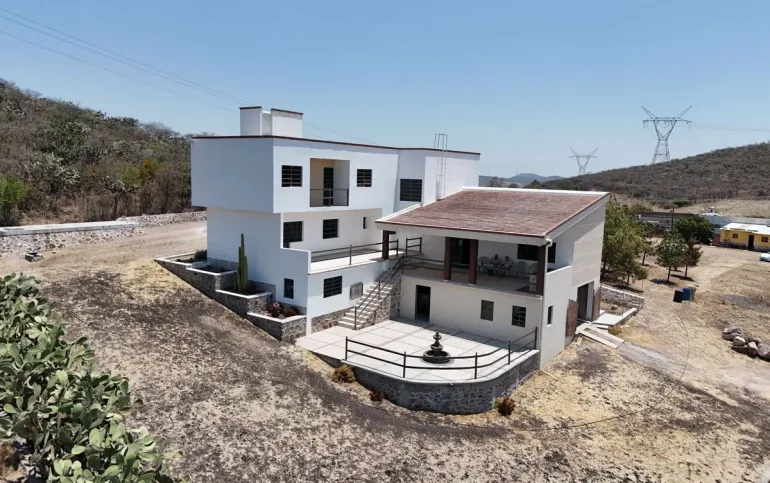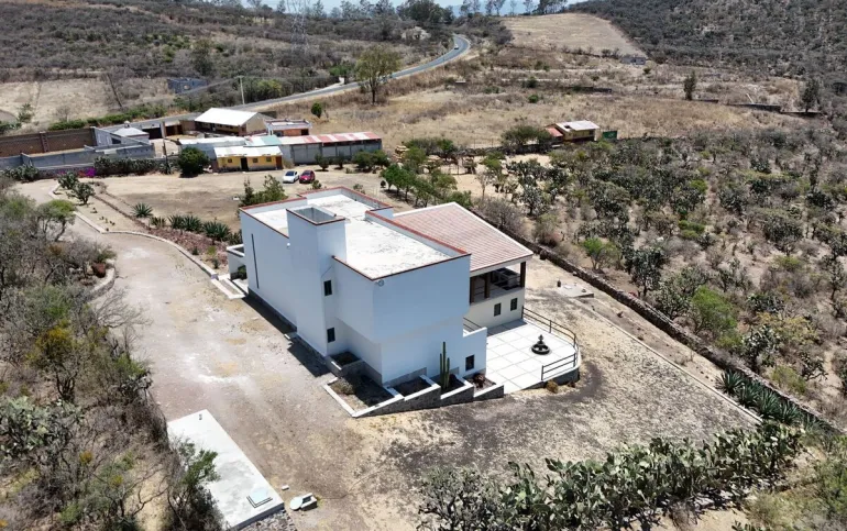 La casa tiene 550 m2 de construcción, 4 recámaras, 3½ baños, despacho, garaje techado para 1 auomóvil y un terreno de 9,000 m2 con árboles frutales, nopales y cactus de la región.