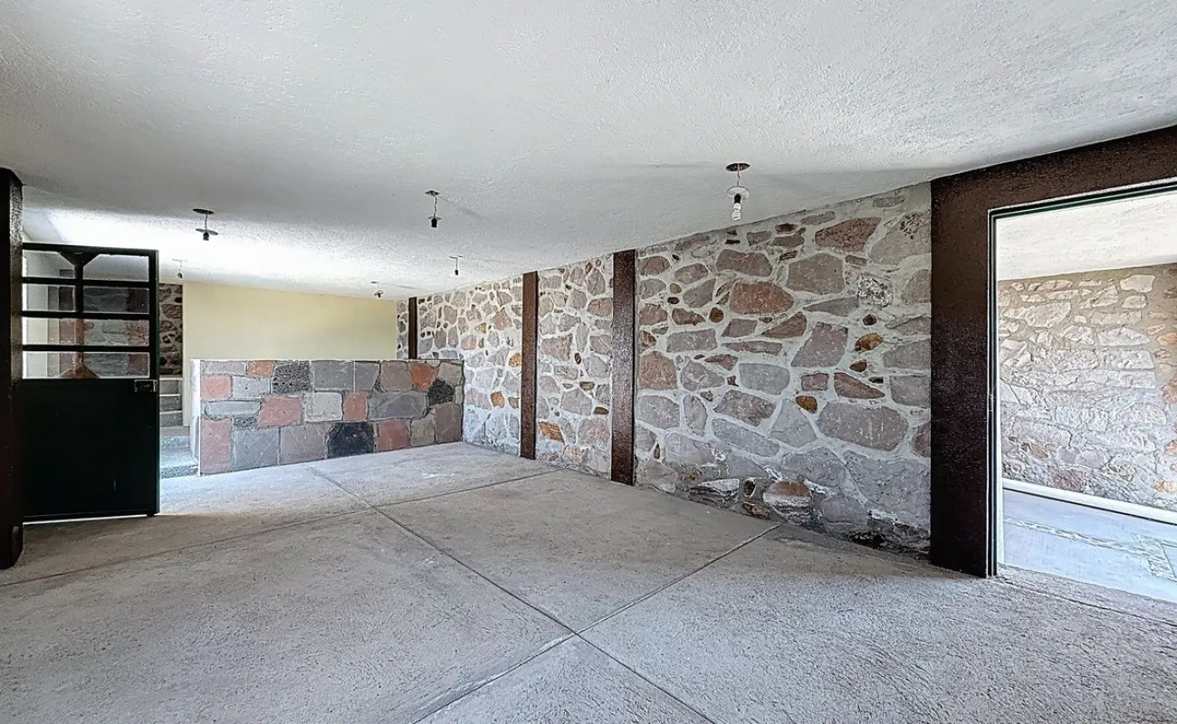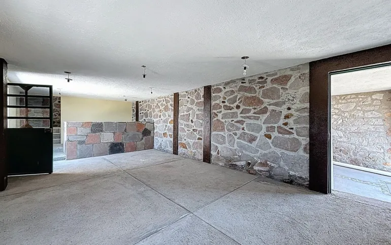 Semisótano: terraza abierta con fuente, salón de juegos, bar, garaje techado para 1 auto, estudio o family room.