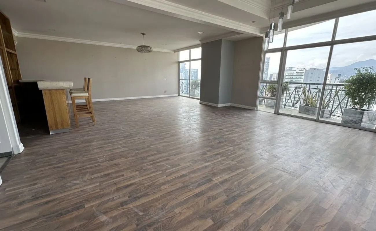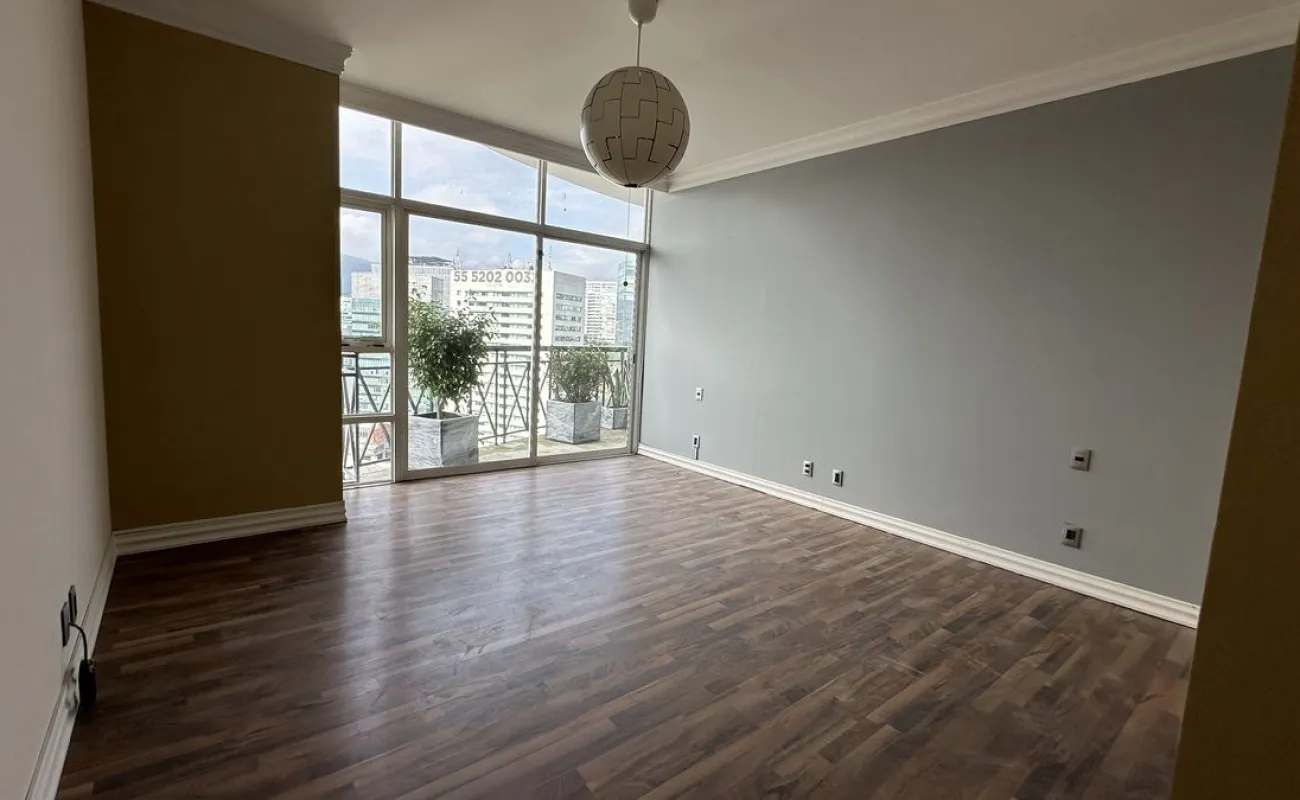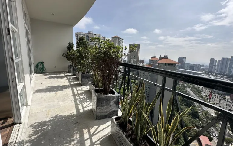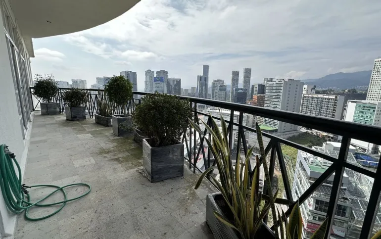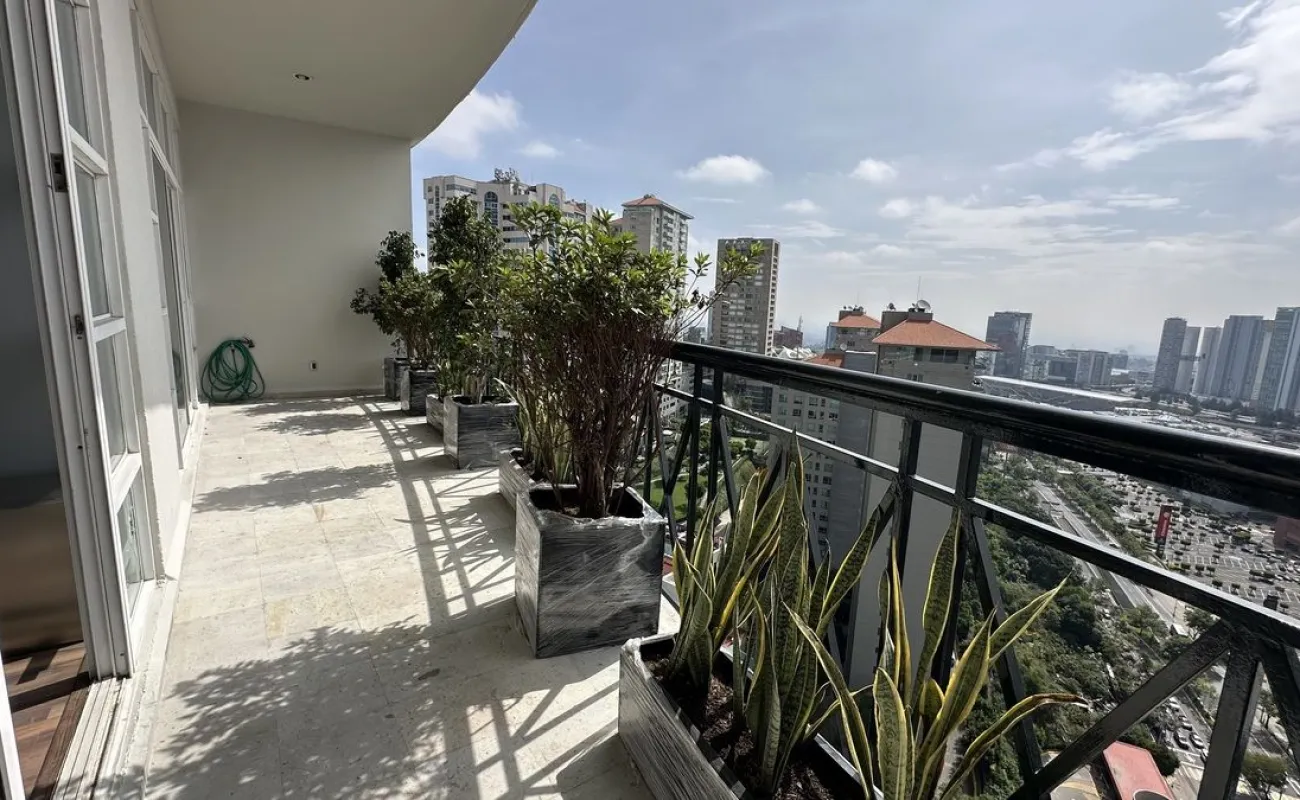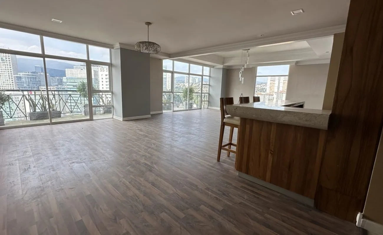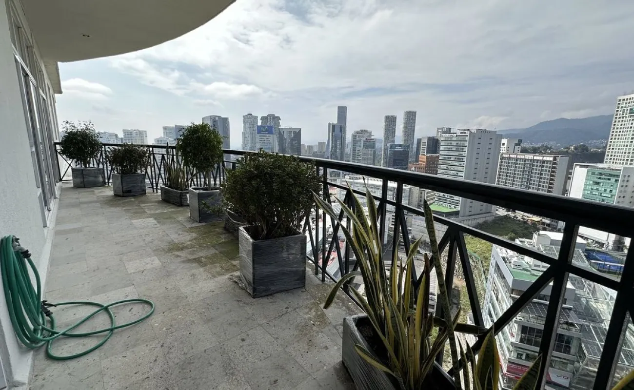 Increíble departamento recién remodelado frente al centro comercial santa fe. Muy iluminado y con vistas panorámicas. Cuenta con 3 muy amplias recamaras cada una con vestidor y baño; family de gran tamaño que da a una terraza secundaria; sala y comedor con barra y mueble de bar para vinos y copas y acceso a una bonita terraza, vestíbulo de acceso, elevador directo al departamento, medio baño de visitas; cocina integral equipada de buen tamaño con espacio para desayunador, cuarto de servicio completo y área de lavandería; calefacción; tres lugares de estacionamiento y bodega.
