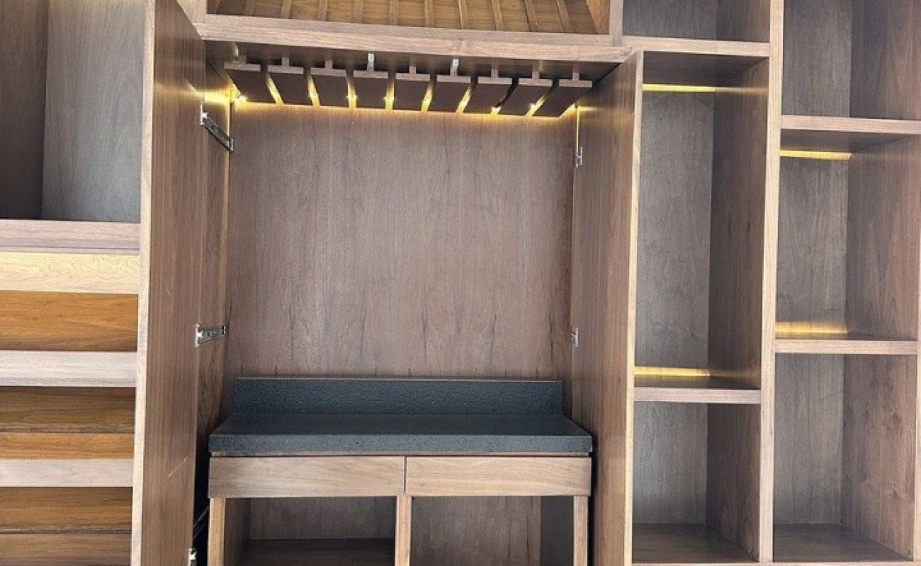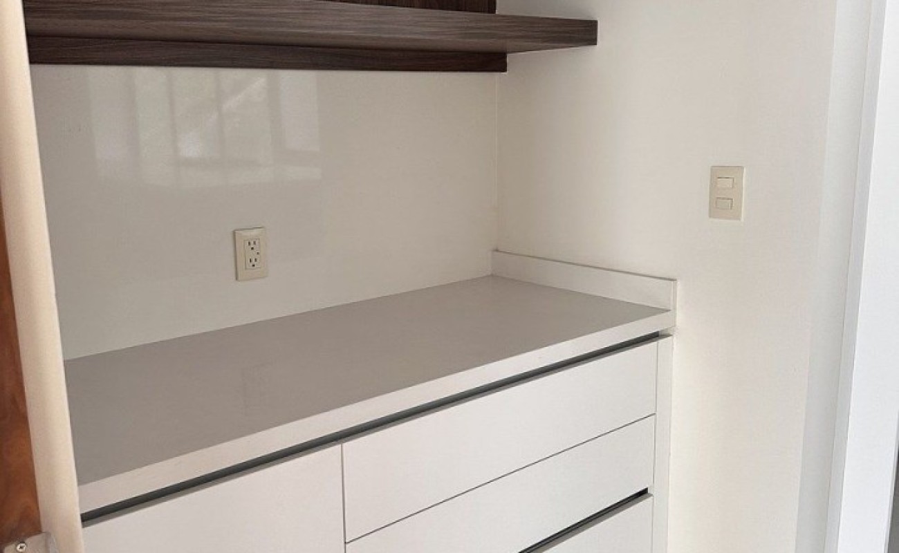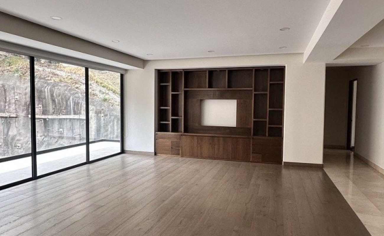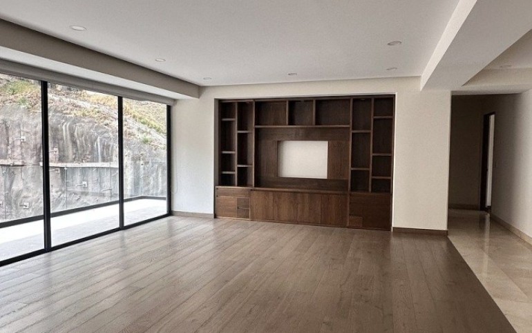 La sala y comedor con mueble empotrado de madera que incluye un bar iluminado tienen acceso a la amplia terraza de 70 m, family con mueble empotrado de TV con salida a la tercer terraza,
