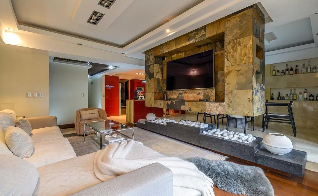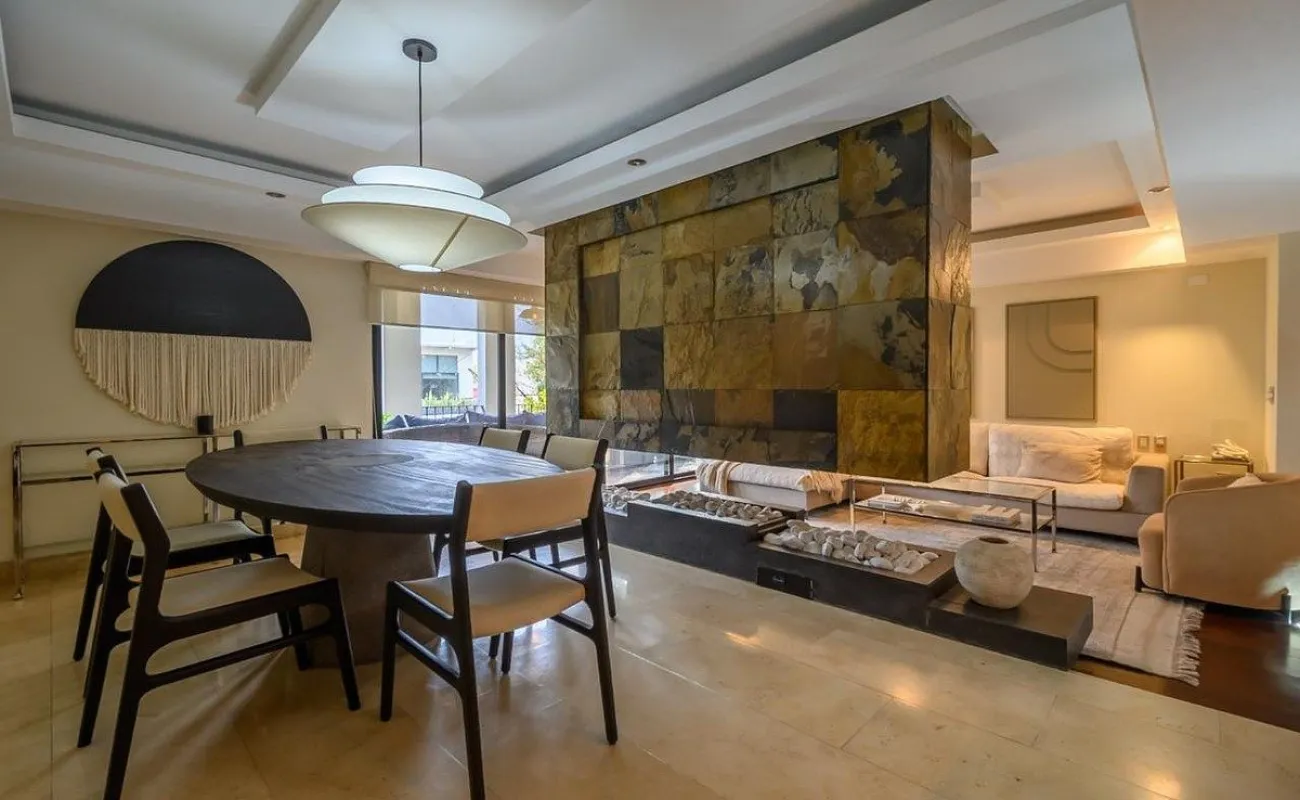 estancia con chimenea y terraza exterior