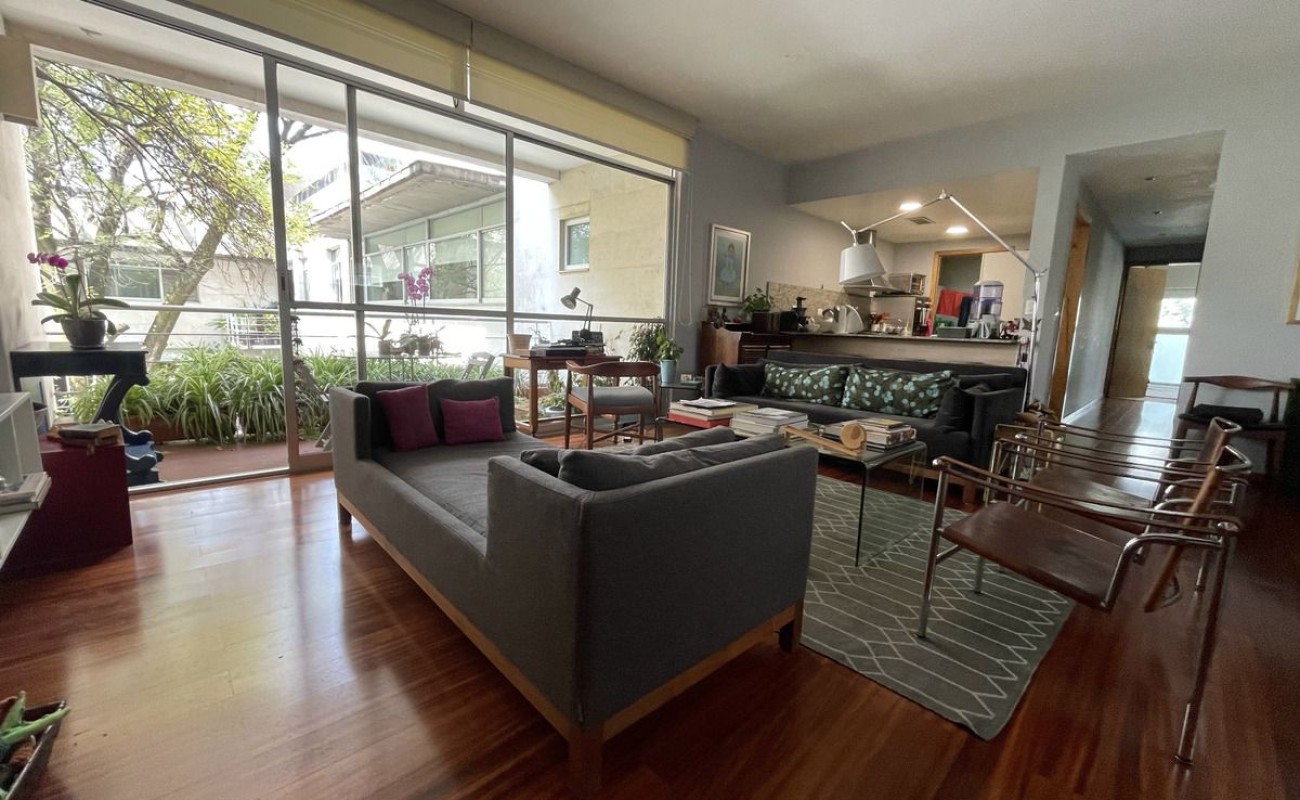 El proyecto integra la sala a una preciosa terraza con vista al jardín interno, creando un ambiente tranquilo y lleno de luz.
