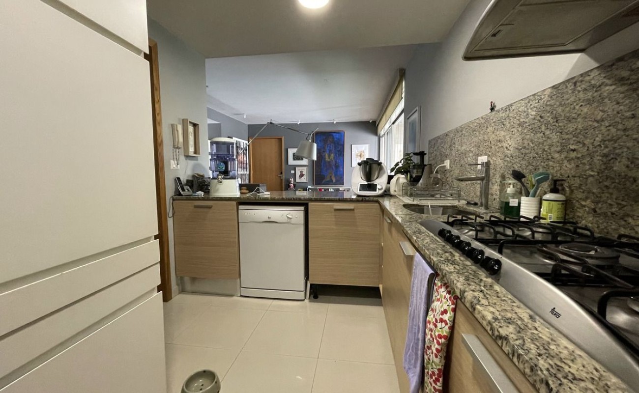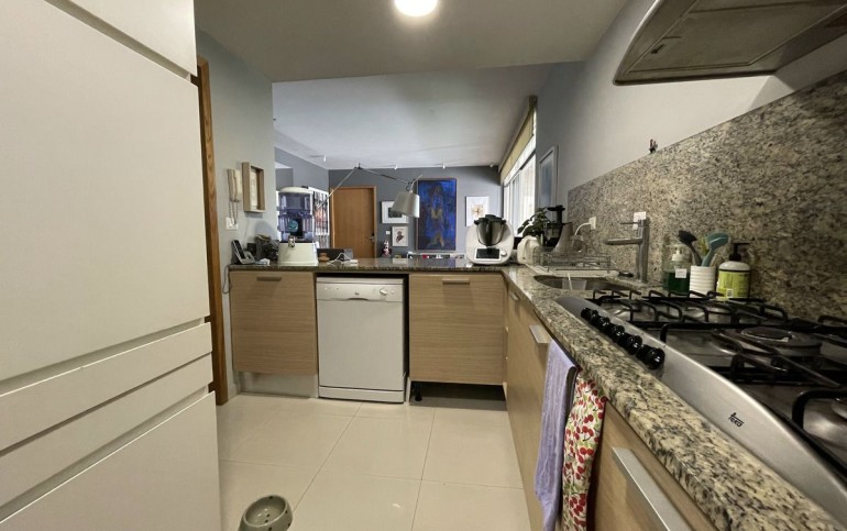 La cocina es abierta, moderna y funcional, con área de lavandería integrada.