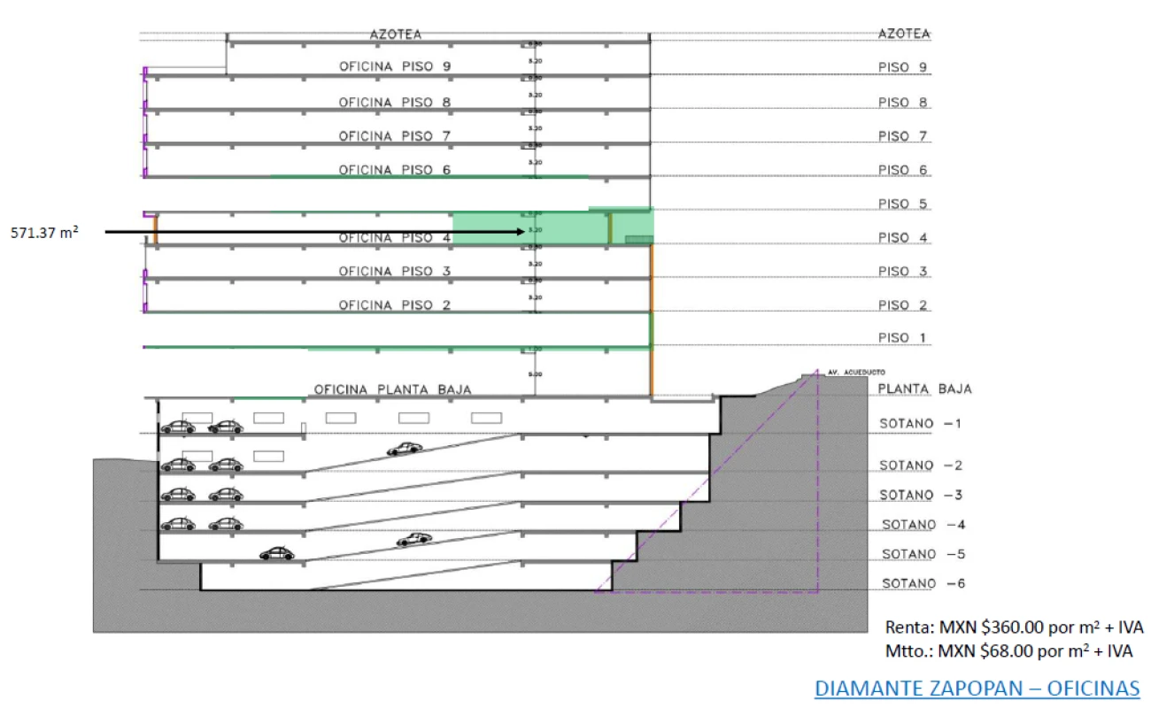 Se renta Oficina (en Obra Gris) en Edificio Dimante Zapopan, Jalisco, con un área de 571.37 mt2, en Piso 4.