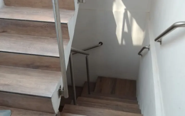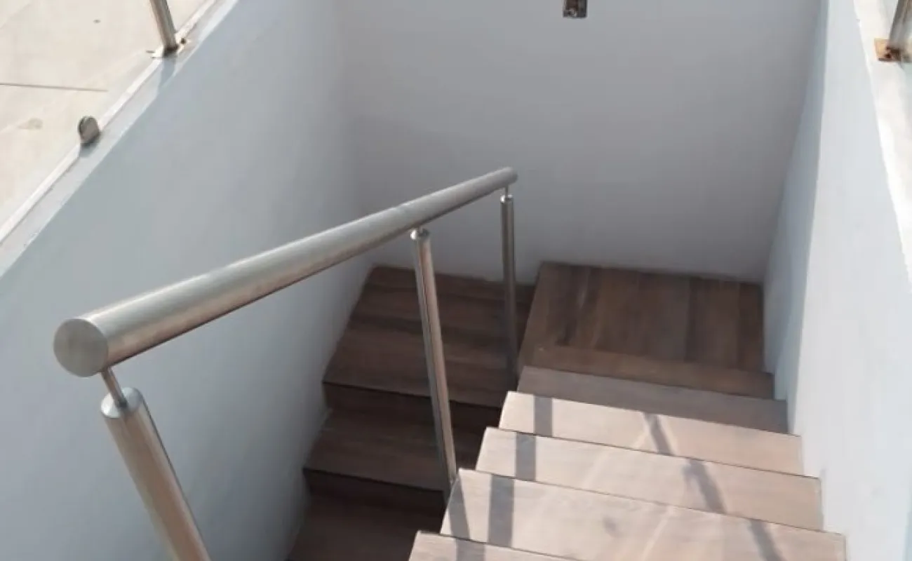 Terraza de cristal templado con barandal de acero inoxidable, iluminación led y solar.