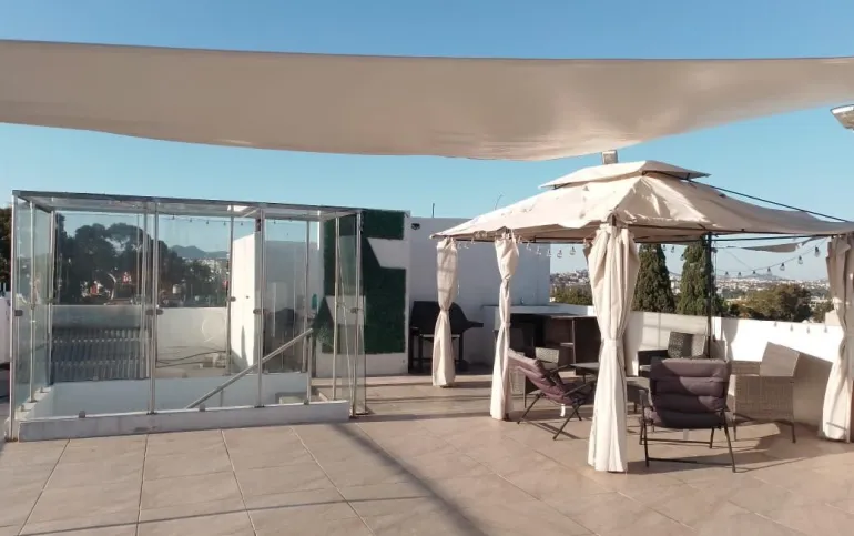 Cuenta con asador, tarja, mobiliario, velaria, y pérgola romana, calentador solar, área de lavado, y 2 tinacos de 1,100 lts.