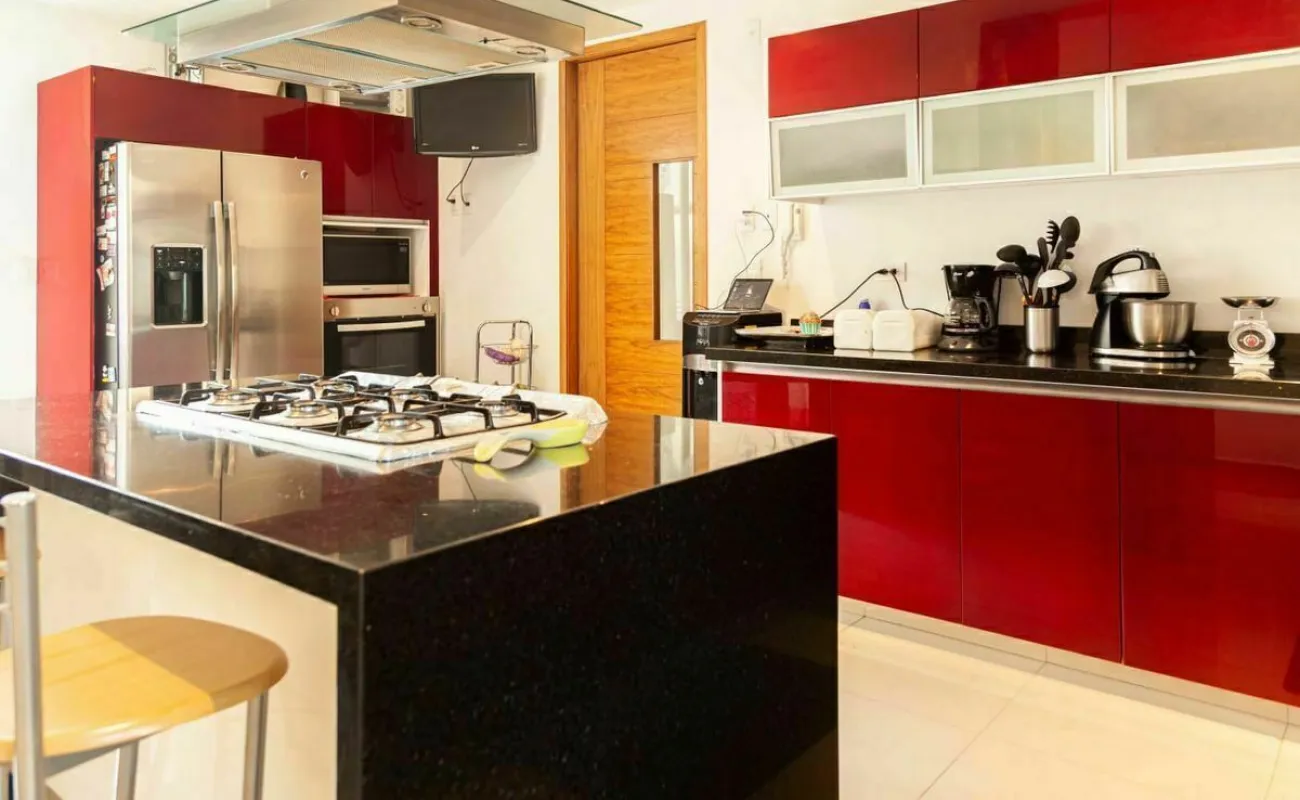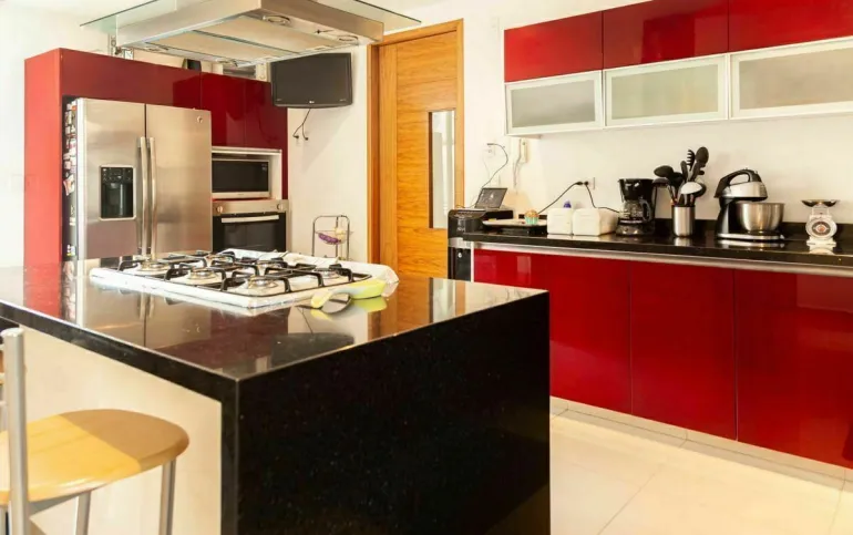 *cocina equipada con isla al centro y campana