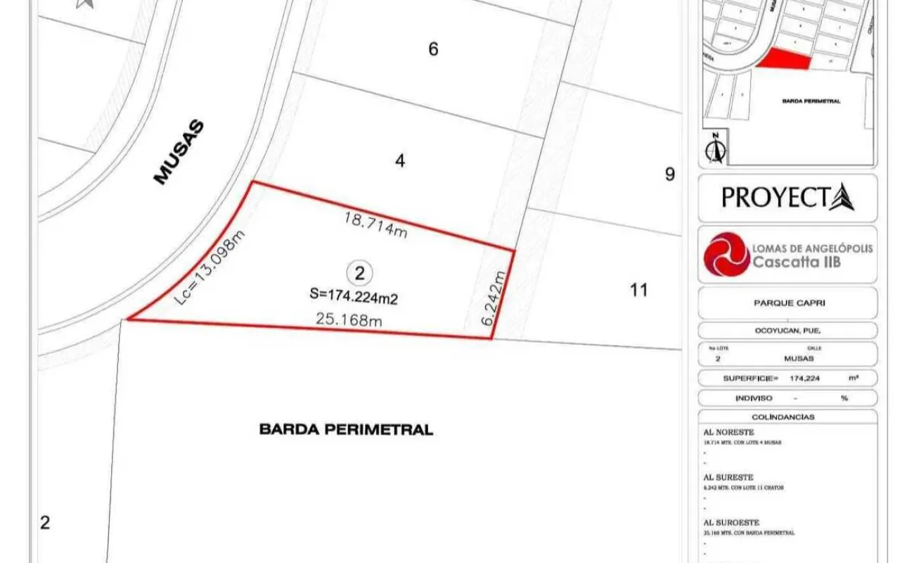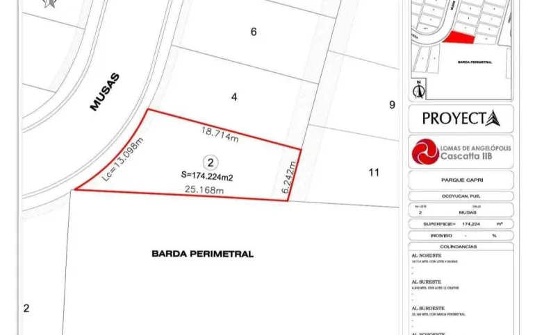 Vendo terreno plano poligonal de 174.2 m2 (21.94 18.04 m x 9.67 m) en Musas, Parque Capri, Lomas de Angelópolis, Puebla.