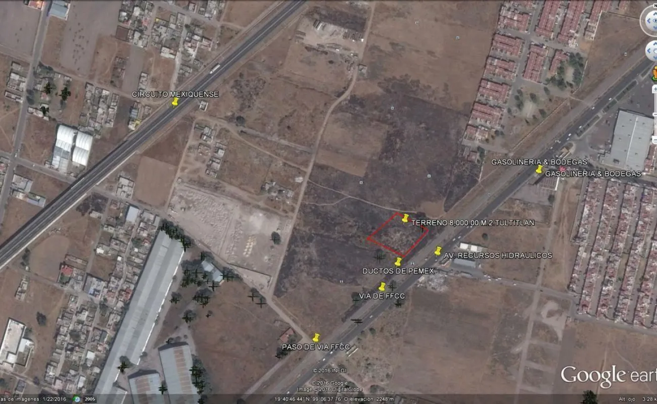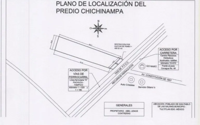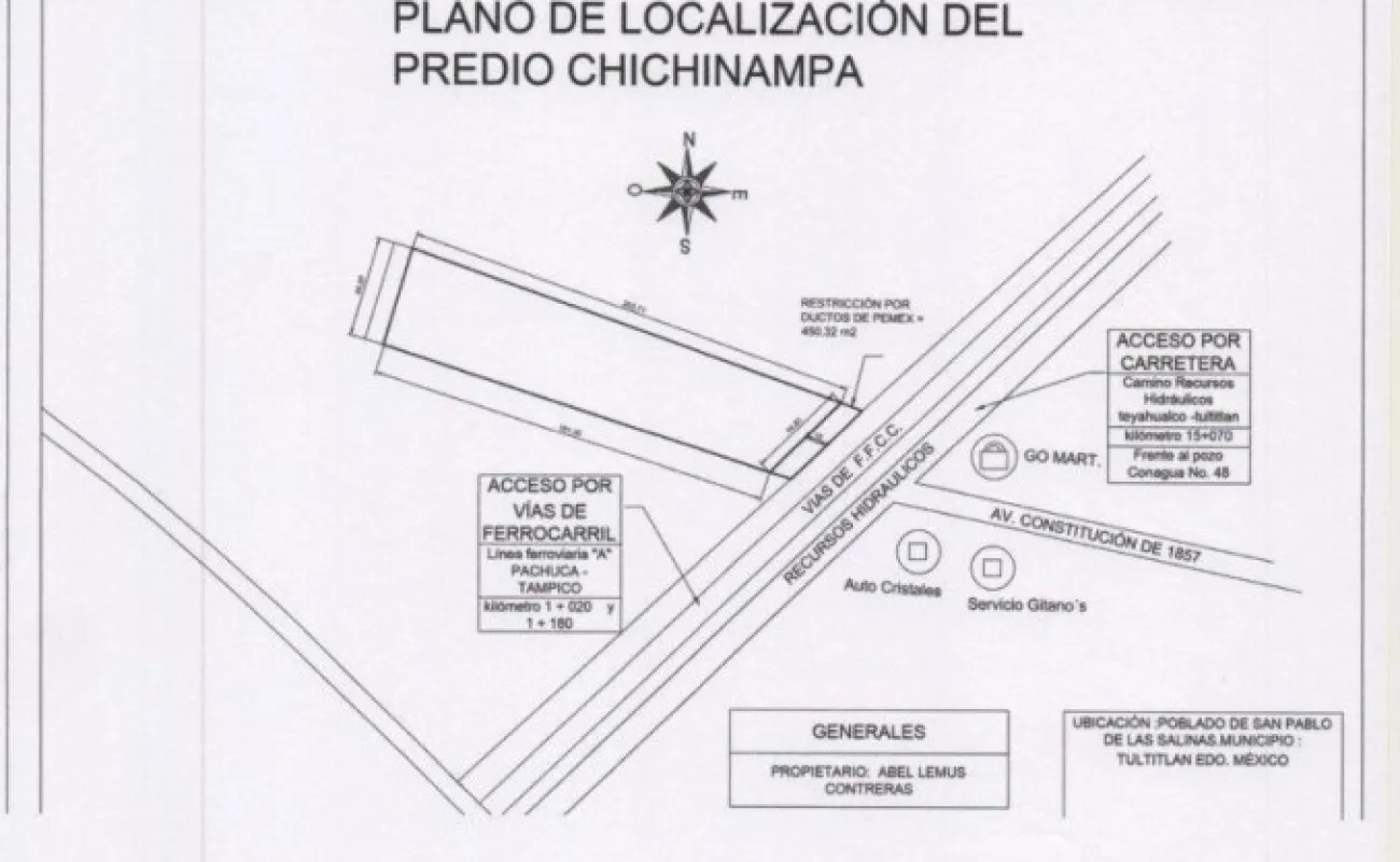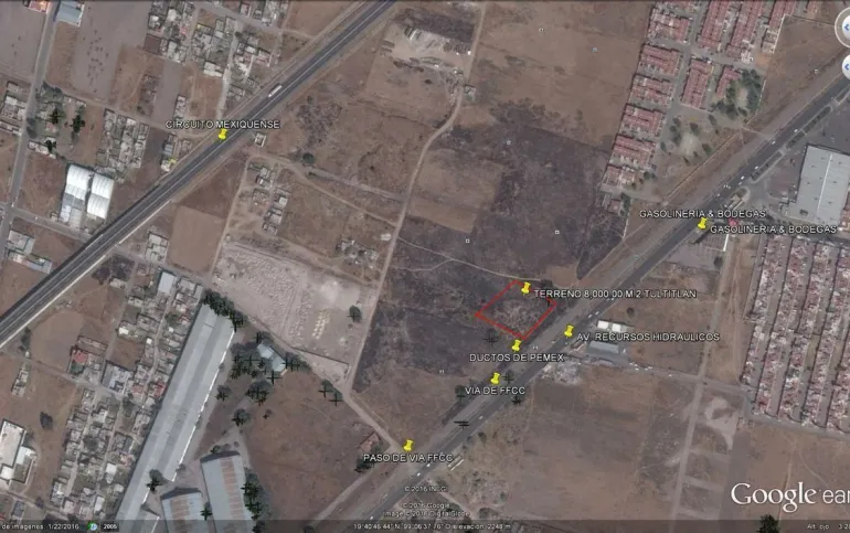 TERRENO INDUSTRIAL Y COMERCIAL. SERVICIOS PUBLICOS Y EQUIPAMIENTO URBANO : AGUA POTABLE, DRENAJE Y ALCANTARILLADO, ENERGIA ELECTRICA Y SERVICIO TELEFONICO, ALUMBRADO PUBLICO, BANQUETAS, GUARNICIONES Y PAVIMENTO. UBICACIÓN : EL TERRENO SE UBICA SOBRE LA AVENIDA DE RECURSOS HIDRAULICOS, MUNICIPIO DE TULTITLAN, ESTADO DE MEXICO. SUPERFICIE DEL TERRENO : LA SUPERFICIE TOTAL ES DE 8,000.00 M.2. TOPOGRAFÍA Y USO DE SUELO : TERRENO REGULAR DE FORMA RECTANGULAR PLANO, LLANO, BALDIO, SIN CONSTRUCCIONES, CON USO DE SUELO COMERCIAL, INDUSTRIAL Y HABITACIONAL, CON EQUIPAMIENTO, O CUALQUIER USO DE SUELO LO PERMITE DESARROLLO URBANO MUNICIPAL. EL TERRENO CUENTA CON LA SIGUIENTE DOCUMENTACION OFICIAL SIGUIENTE : • LICENCIA DE USO DE SUELO ESPECIFICA PARA INDUSTRIA, MISMO QUE SE PUEDE CAMBIAR A CUALQUIER OTRO USO DE SUELO. • CONSTANCIA DE ALINEAMIENTO Y NUMERO OFICIAL. • ESCRITURA PUBLICA SIN GRAVAMEN. • PERMISO PARA CONSTRUCCION DE CRUCE DE VIAS DE LA LINEA “ A “ PACHUCA – TAMPICO, CON ACCESO VEHICULAR Y PEATONAL. • EL TERRENO CUENTA ACTUALMENTE CON CRUCE DE VIA CON ACCESO VEHICULAR Y PEATONAL A 50 METROS DEL TERRENO. • FERROVALLE PERMITE EL LIBRE ACCESO VEHICULAR POR EL LADO INTERIOR JUNTO A LA VIA HACIA EL TERRENO. • PERMISO PARA EL PASO Y CRUCE DE LOS DUCTOS DE MAXIGAS. • IMPUESTO PREDIAL PAGADO. EQUIPAMIENTO Y SERVICIOS DEL INMUEBLE : TODOS LOS QUE PROPORCIONE EL MUNICIPIO, OTORGANDO AMPLIAS FACILIDADES PARA LOS DESARROLLOS COMERCIAL, INDUSTRIAL Y HABITACIONAL EN ESTE LUGAR. USO PREFERENTE Y AMENIDADES : EL BIEN INMUEBLE SE ENCUENTRA UBICADO SOBRE LA AVENIDA DE RECURSOS HIDRAULICOS, ES IDEAL PARA DESARROLLAR COMPLEJO INDUSTRIAL, BODEGAS, CENTROS DE DISTRIBUCION, HOTEL O COMERCIOS, CUENTA CON TODOS LOS SERVICIOS NECESARIOS, ADEMAS DE TRANSPORTE MASIVO PUBLICO Y PRIVADO EN ABUNDANCIA, MUY CERCANO AL CIRCUITO EXTERIOR MEXIQUENSE. PRECIO DE VENTA : $ 3,000.00 POR METRO CUADRADO