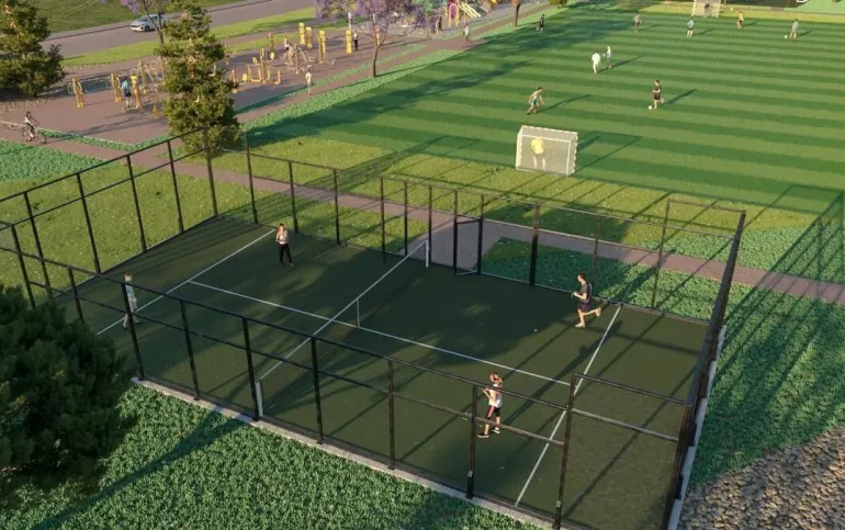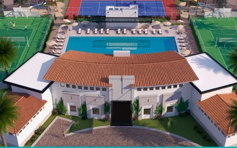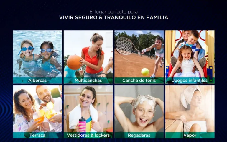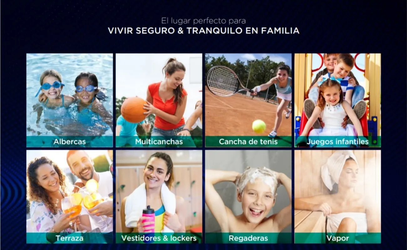 gimnasio, salón de usos múltiples, salón de juegos, ludoteca, alberca al aire libre, alberca pequeña con tobogán, enfermería, área de juegos infantiles, canchas de padel, áreas verdes, snack bar, baños, multicanchas y canchas de tenis.