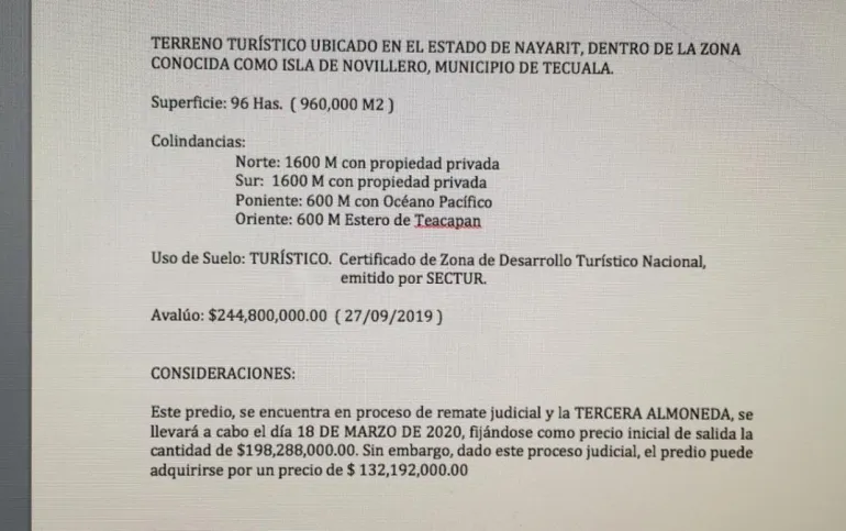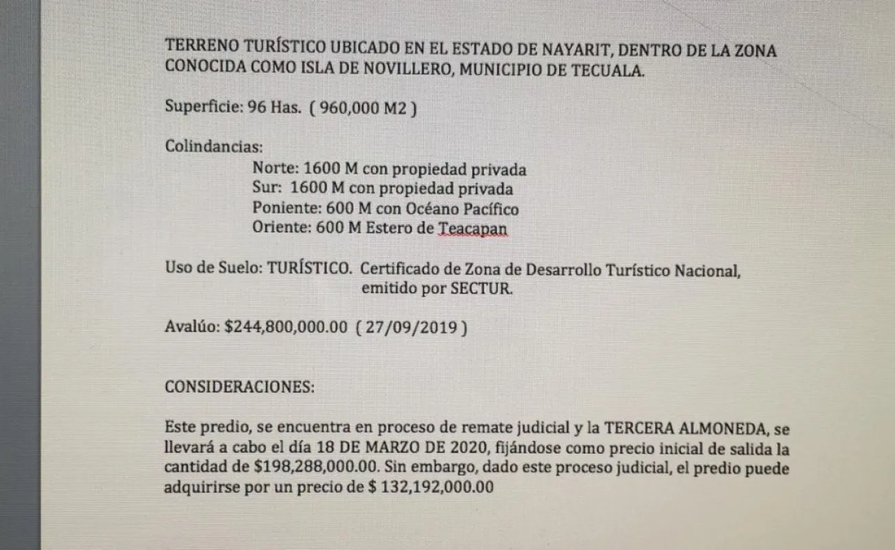 Terreno turístico de 96 hectáreas (960,000 m2) ubicado en Isla del Novillero, en Tecuala, en el Estado de Nayarit, dentro de la zona conocida como Isla del Novillero, Municipio de Tecuala.