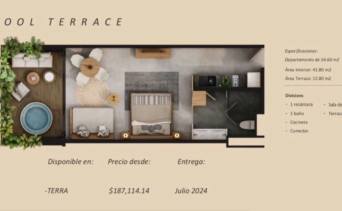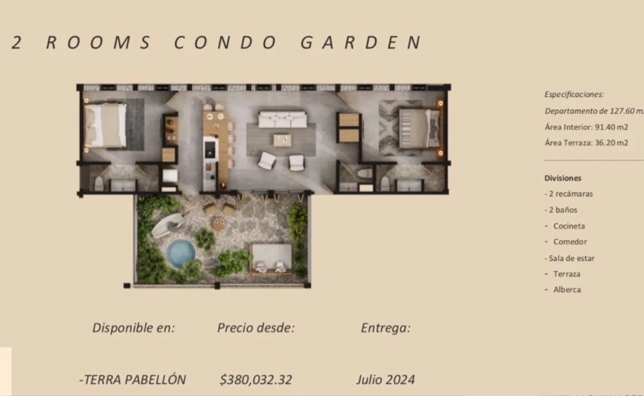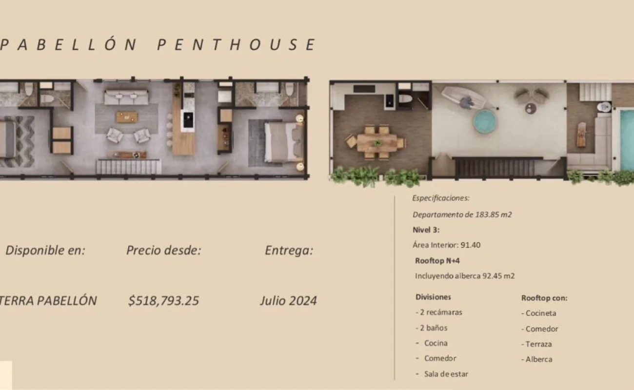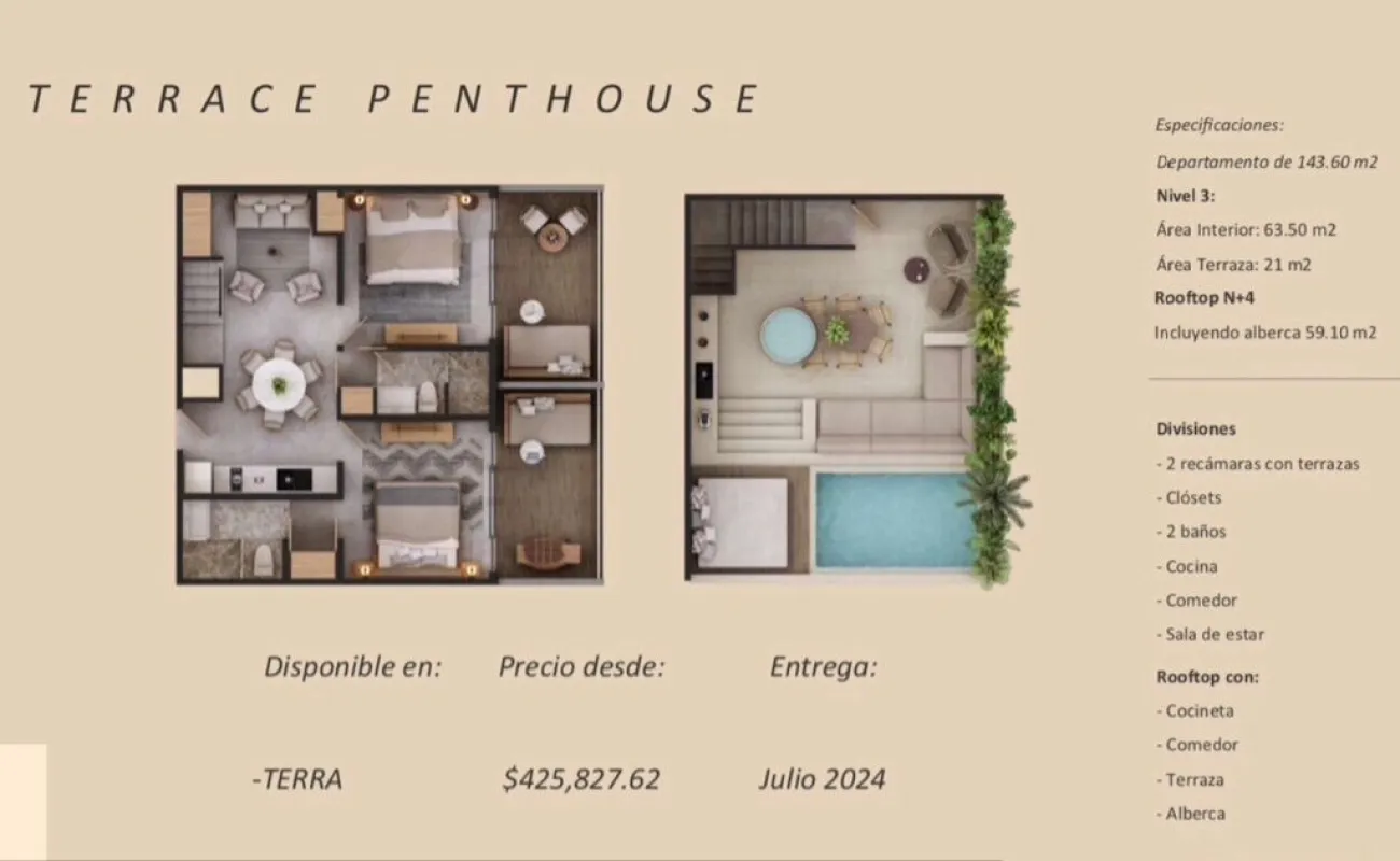* TERRA Son 3 torres con 46 unidades, áreas privadas de swim ups y alberca cenote común. (Entrega Jul 2024)
