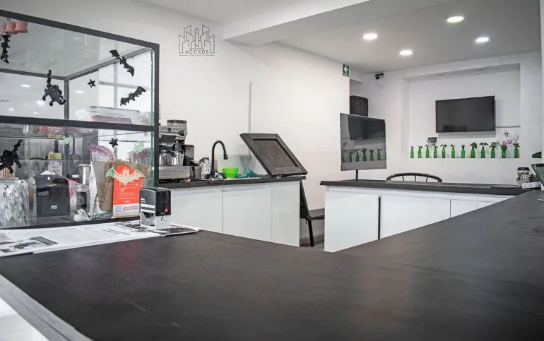 El último uso que se le dio fue de cafetería y las fotografías que tenemos son cuando estaba montado ese negocio. Actualmente se encuentra sin mobiliario ni equipos. Tiene 2 medios baños.