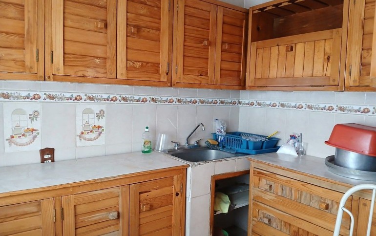 Cocina construida en mampostería, con puertas de madera, de diseño tradicional y funcional.