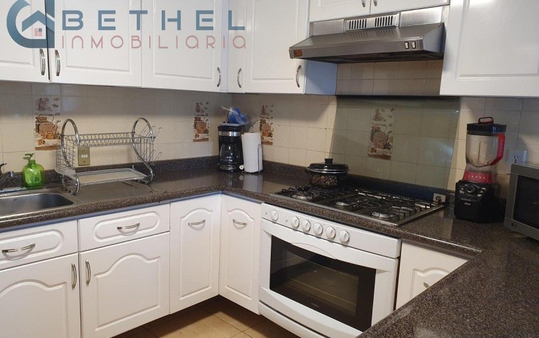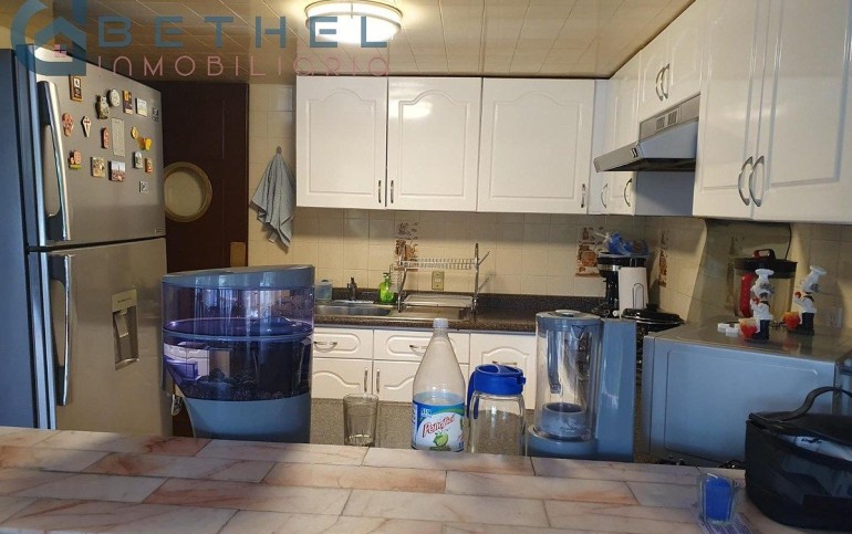 Cocina abierta con cocineta, barra de mármol, campana y cubierta de melamina, con puertas de madera en color blanco. Se integra perfectamente con el área social.