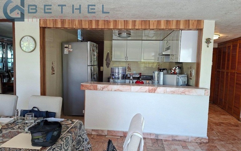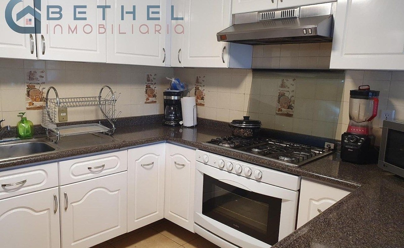 Cocina abierta con cocineta, barra de mármol, campana y cubierta de melamina, con puertas de madera en color blanco. Se integra perfectamente con el área social.