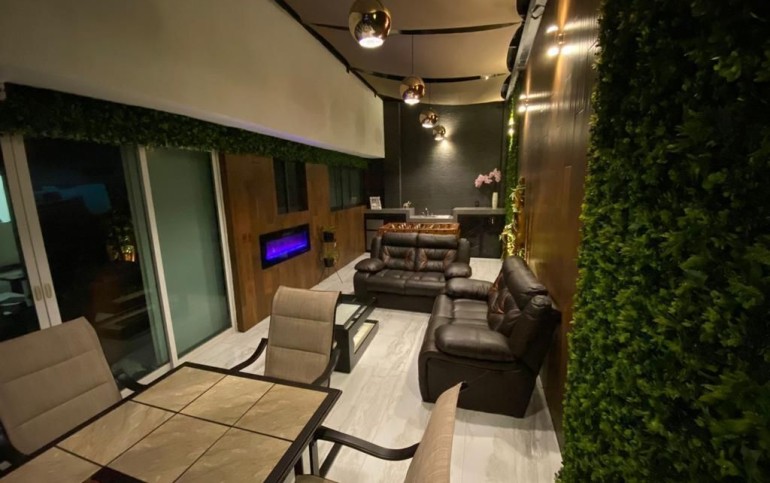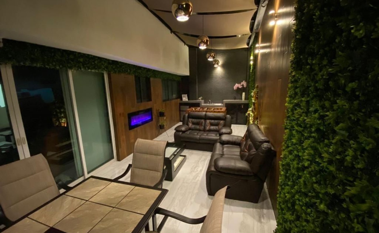Cuarto para vistas con baño terraza con juegos chimenea eléctrica y comedor, cuarto de lavado.