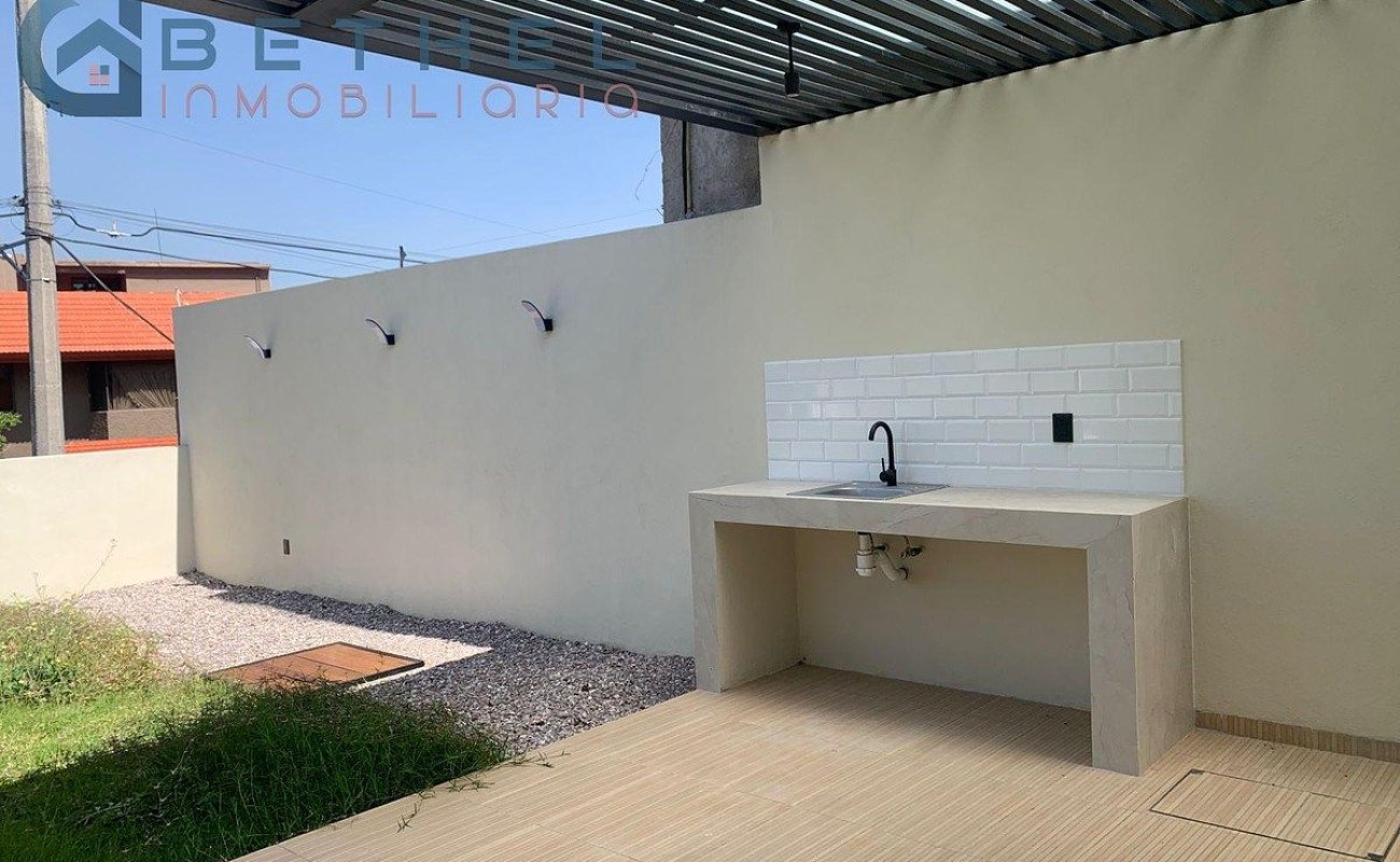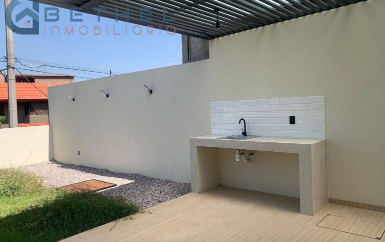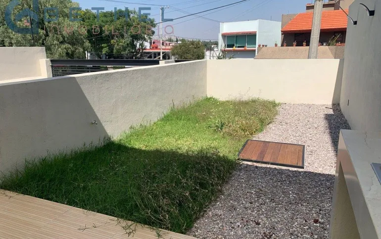 Terraza exterior semitechada con jardín al frente, ideal para reuniones, descanso o área social al aire libre.