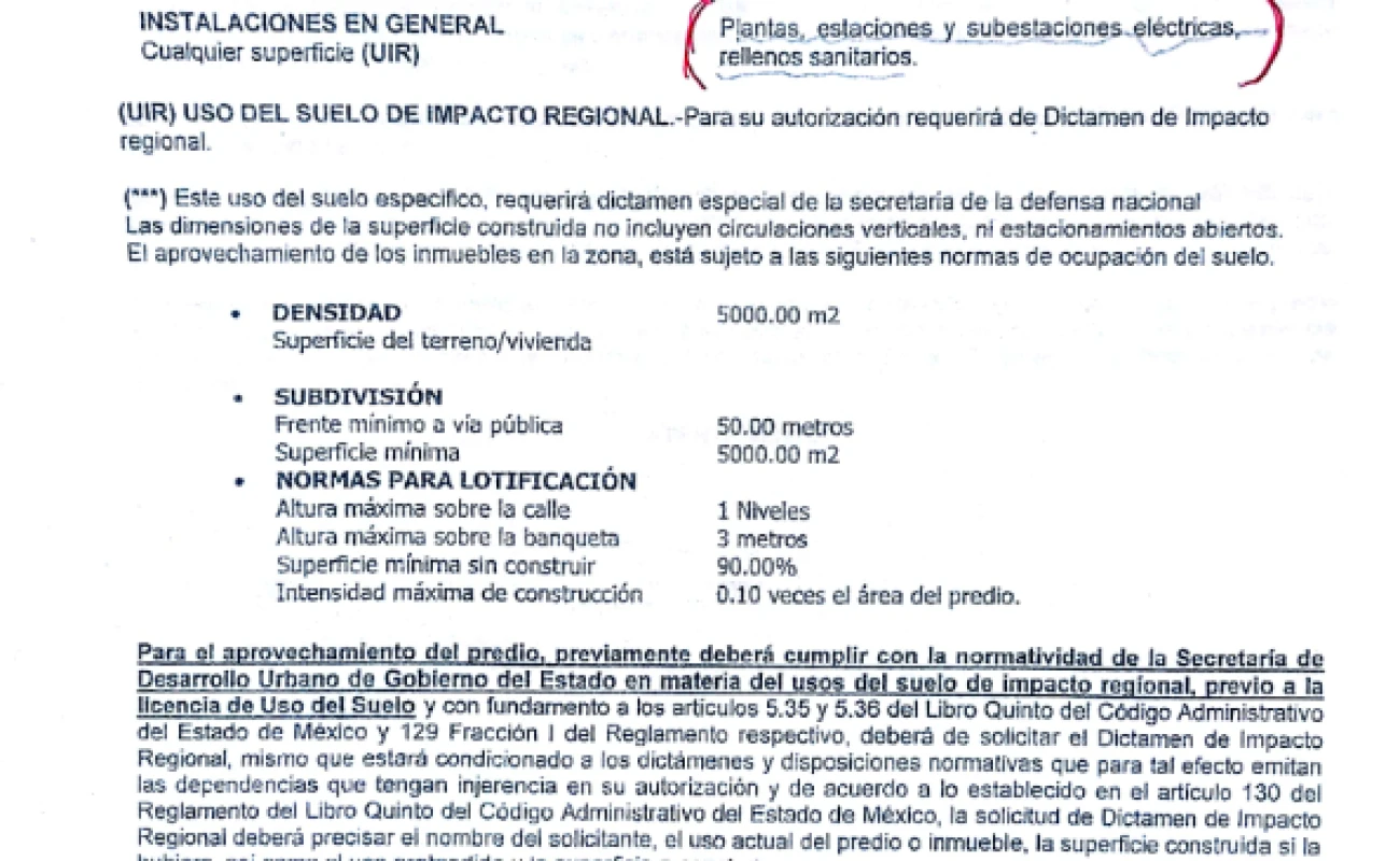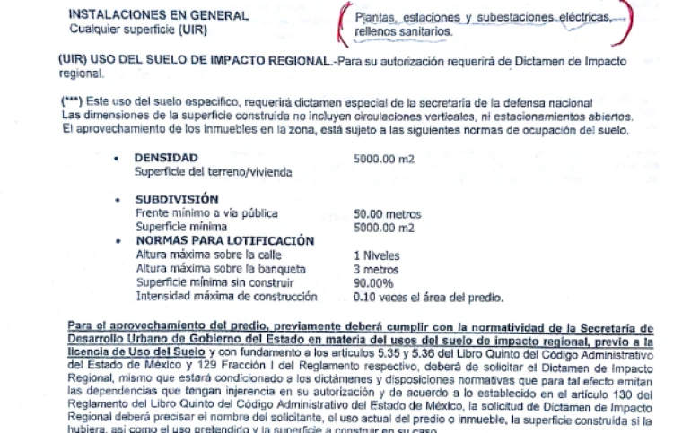 Por el terreno pasa vías de tren y Torres de Alta Tensión. El terreno puede ser de uso Industrial, para paneles solares o también tiene uso de suelo para Relleno Sanitario.