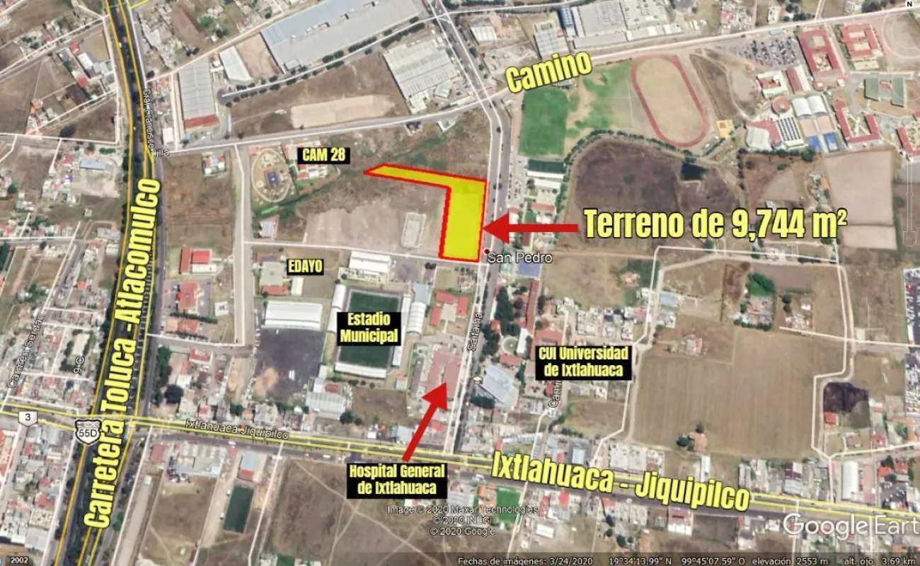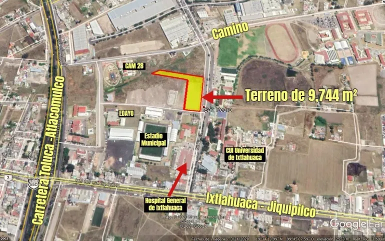 Vendo terreno de 9,744 m, ubicado en una de las mejores zonas de Ixtlahuaca de Rayón. Está enfrente de la Universidad, sobre la misma calle hay un hospital, plaza comercial, varias escuelas, Estadio Municipal. El Centro de Justicia está a unas cuadras de distancia. El Centro Histórico se encuentra a solo kilómetro y medio de distancia.