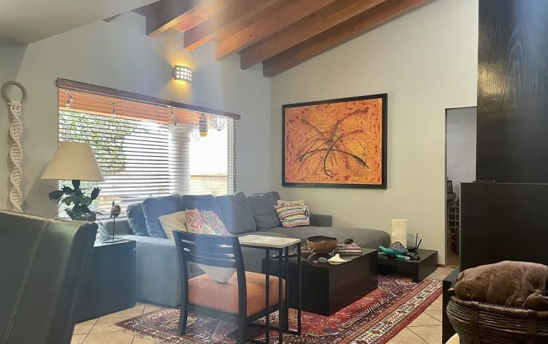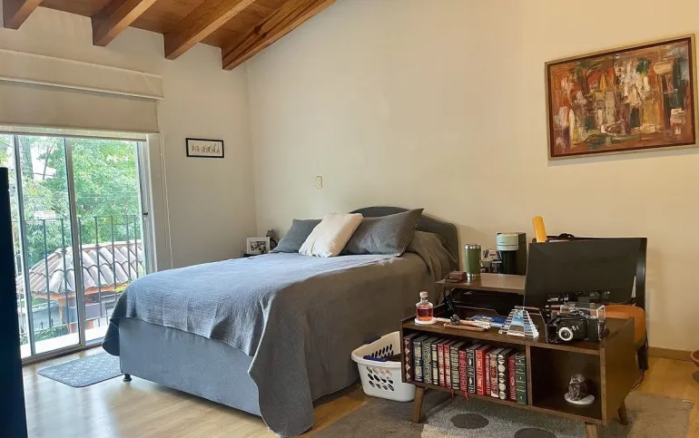 3 RECÁMARAS CON BAÑO, Y BALCÓN, LA PRINCIPAL CUENTA CON VESTIDOR. CUARTO DE TV. TECHOS ALTOS CON VIGAS DE MADERA.