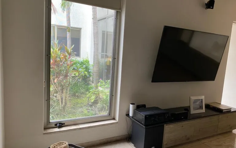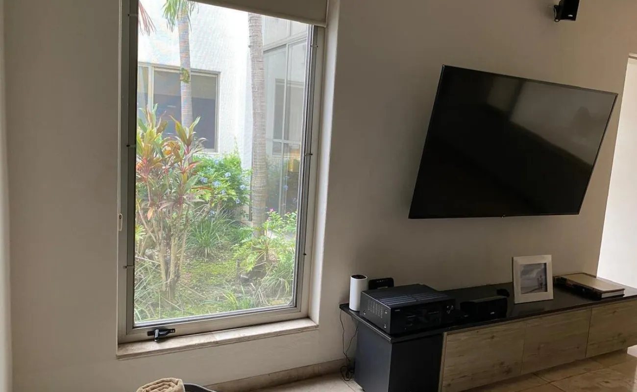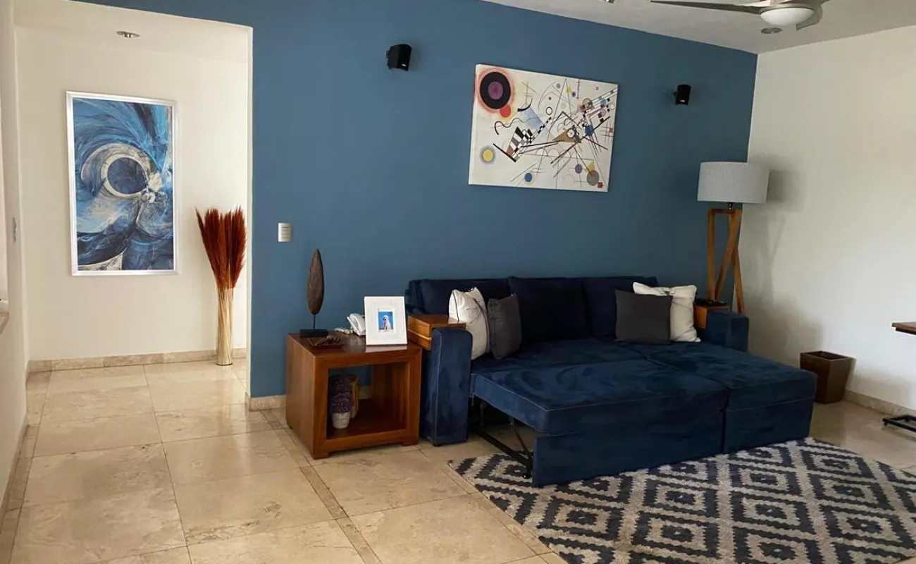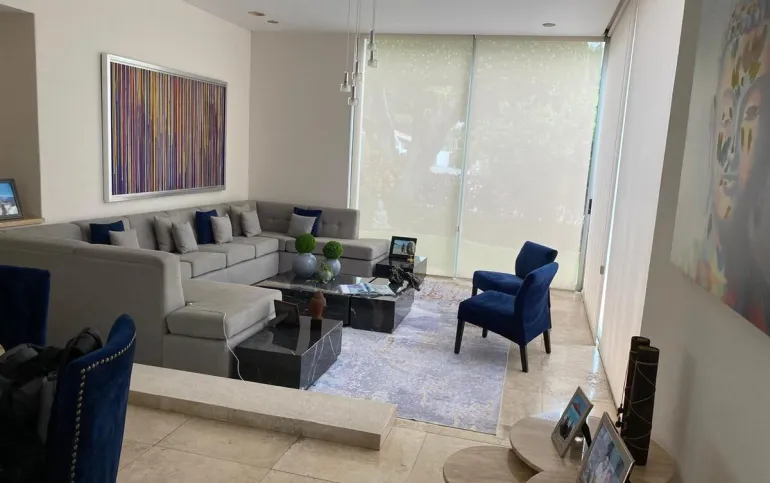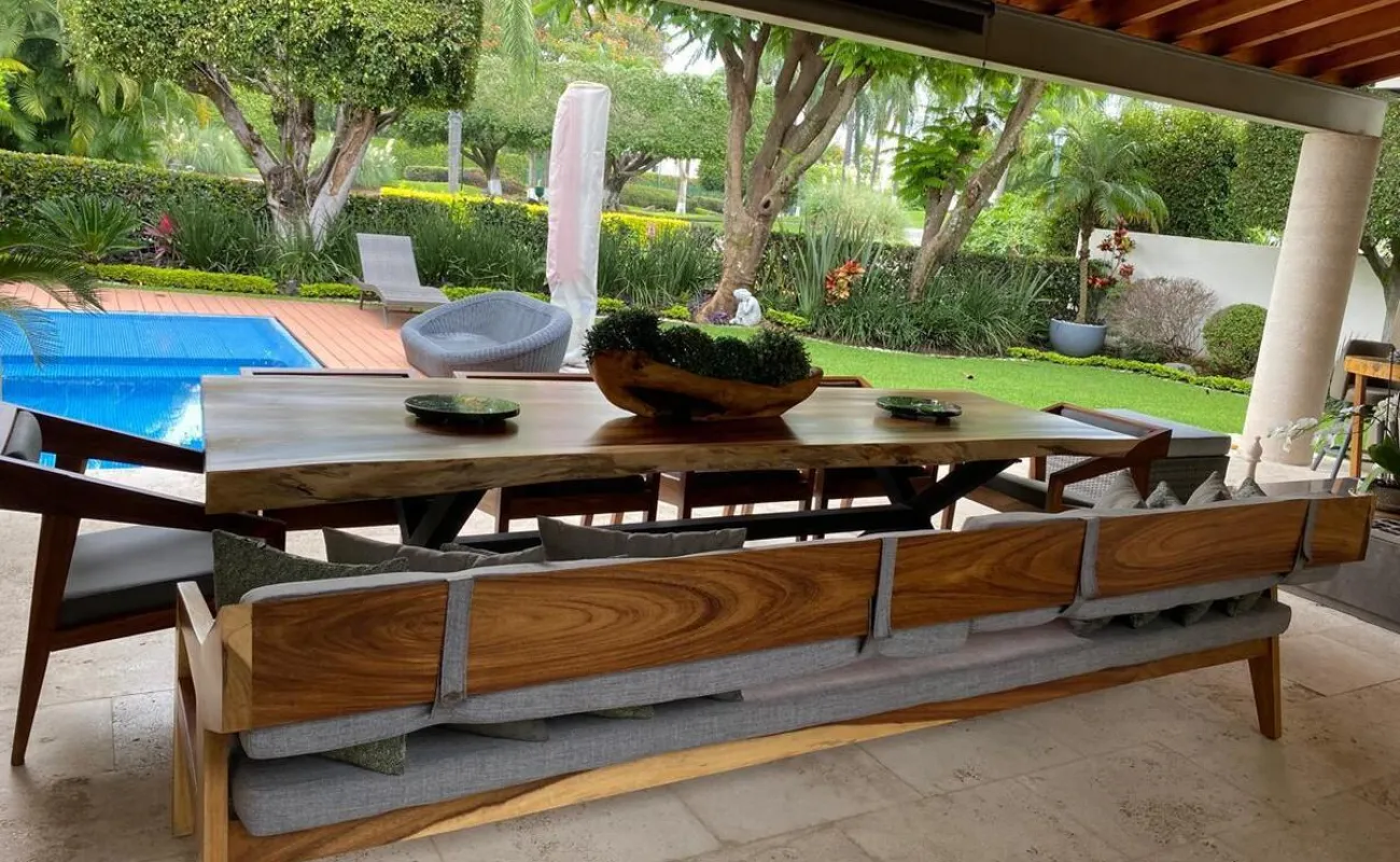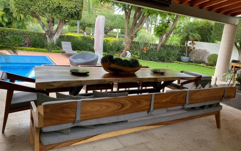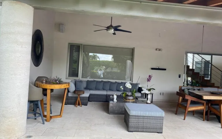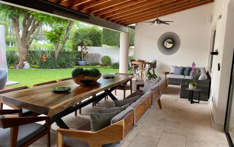 Estancia con con una hermosa vista a la terraza, jardín y a la alberca.