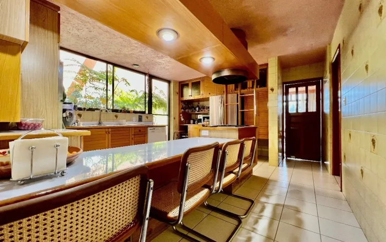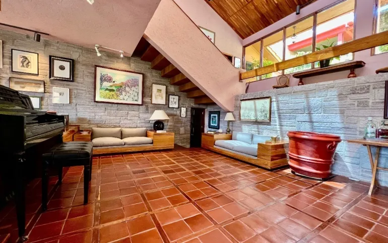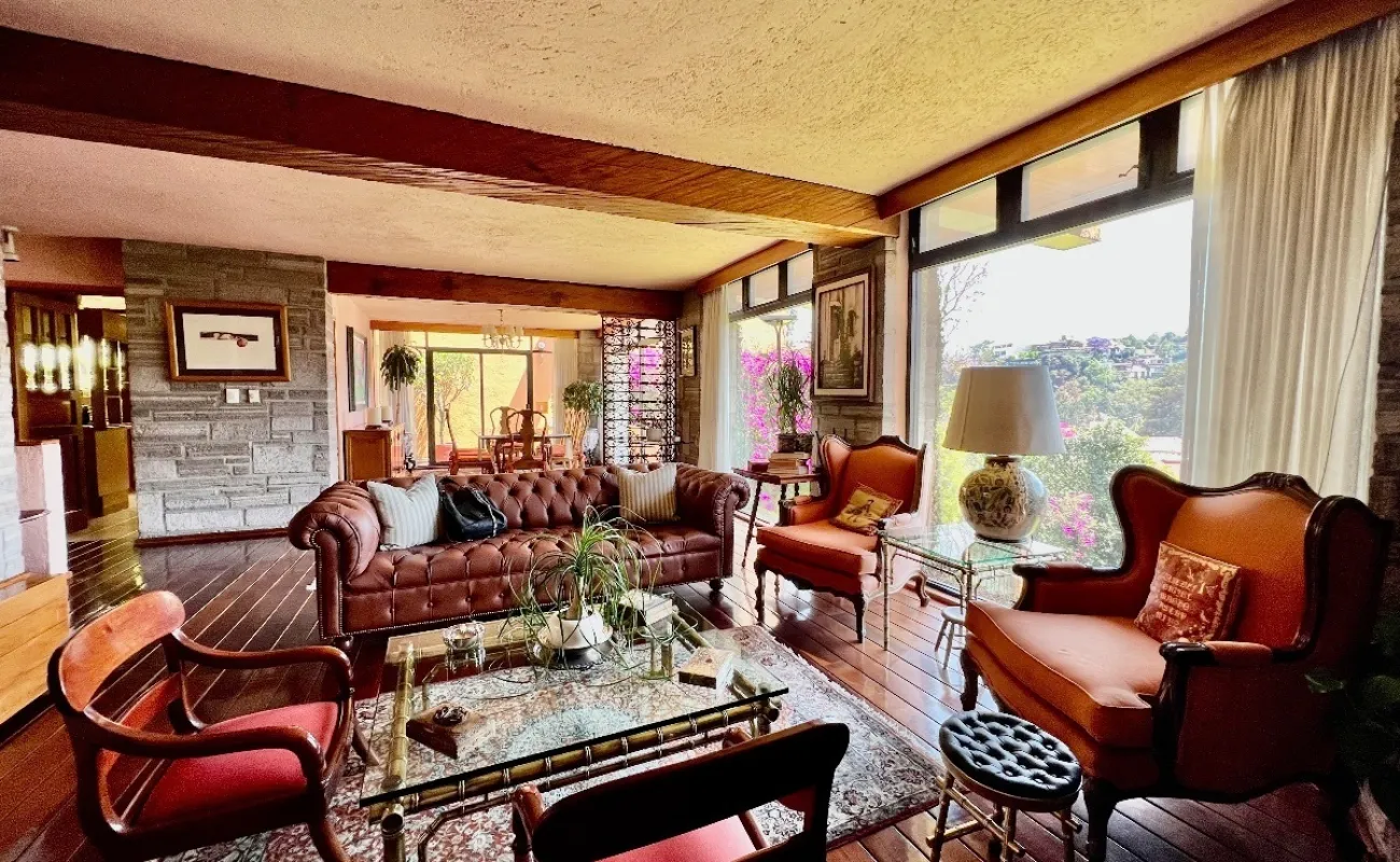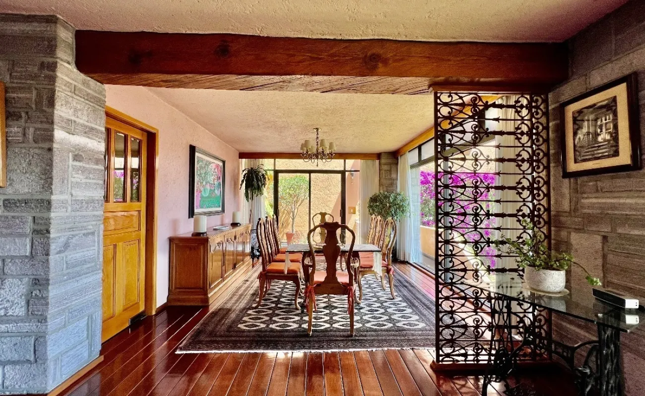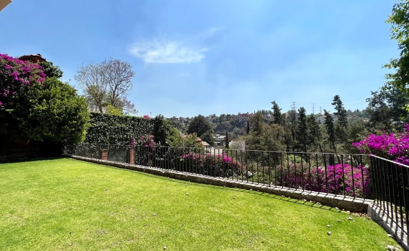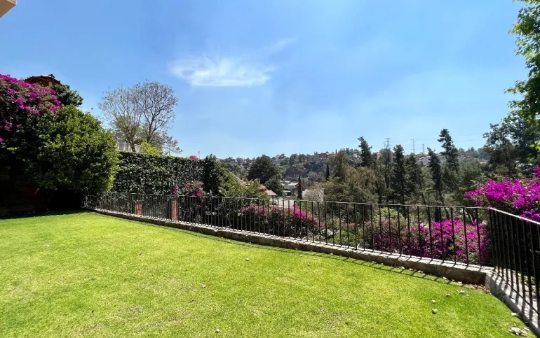 Preciosa casa en la Herradura muy iluminada con ventana que dan a una vista increíble al bosque. Cuenta con sala con chimenea muy acogedora, ,comedor y una sala secundaria con vistas espectaculares al jardín. Dos preciosos jardines de 100m2 aproximadamente con riego de aspersión y un medio baño en el jardín. Cuenta con un agradable family y oficina Cocina, cuarto de servicio y cuarto de lavado amplios. Consta de 4 recámaras, la principal con vista al jardín con techos altos, increíbles vigas de madera, baño completo y walking closet. Las demás recámaras tienen baño completo y closet. Garage techado, dos bodegas, paneles solares, sistema de alarma, bomba hidroneumática. La casa está súper bien conservada, con excelentes acabados, pisos de duela de madera.