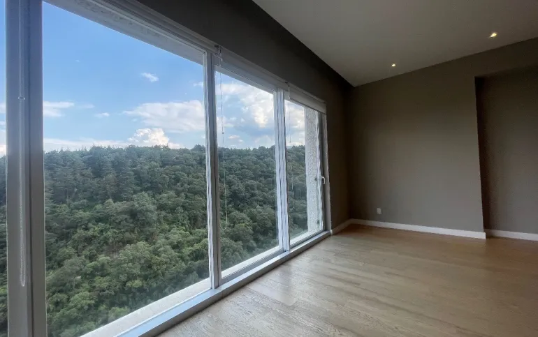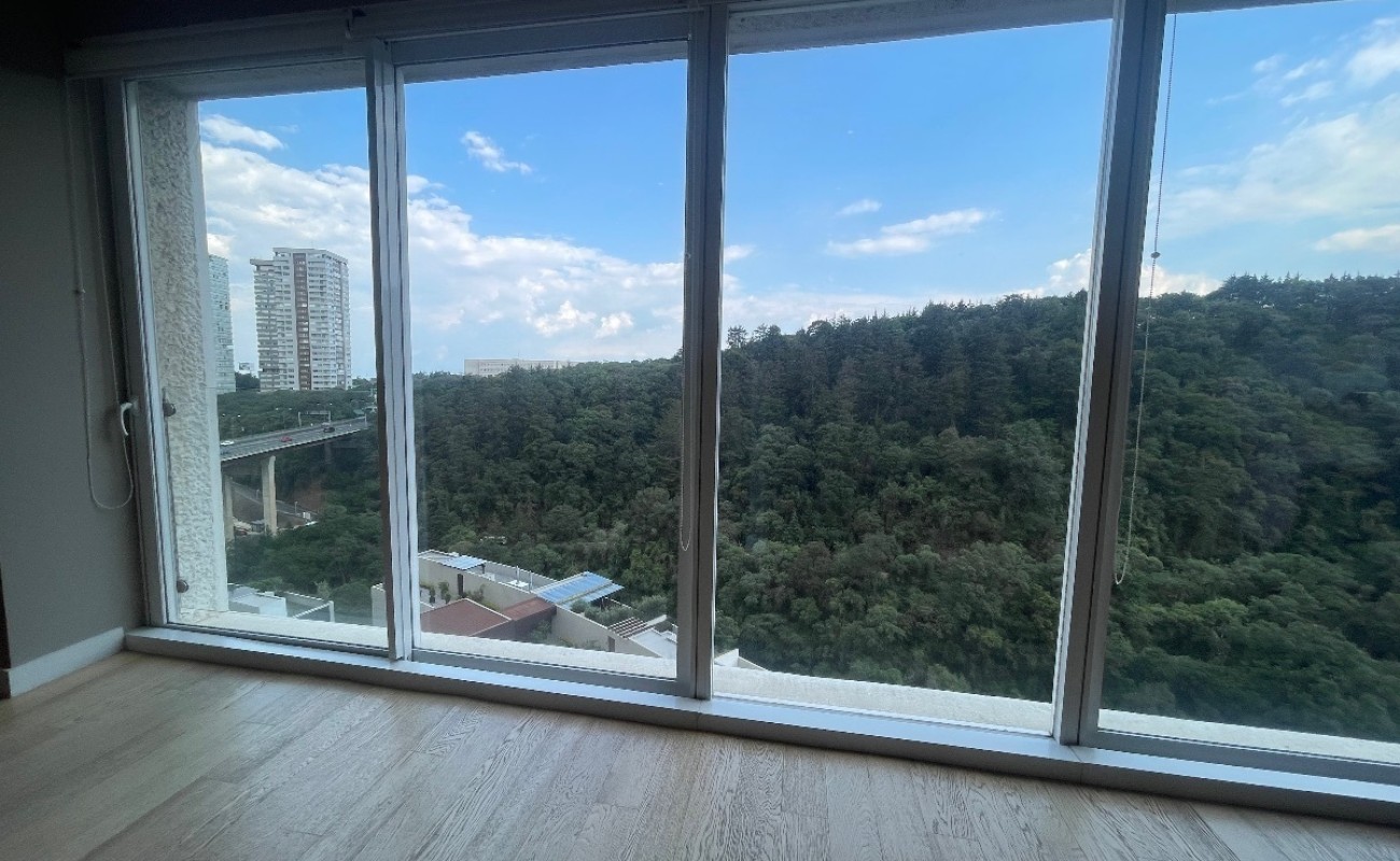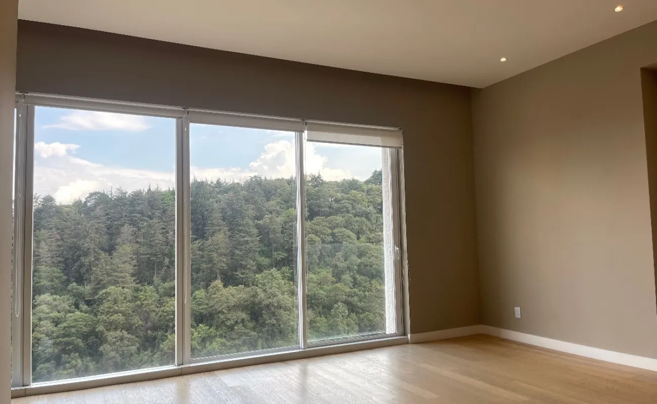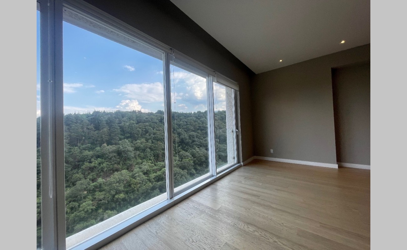 Departamento de lujo en zona exclusiva. En medio de bosques e impresionantes vistas. Gimnasio, alberca techada, canchas de pádel, salón de eventos, salón de usos múltiples, salón de jóvenes, ludoteca, áreas verdes, casa club en Cumbres Santa Fé.