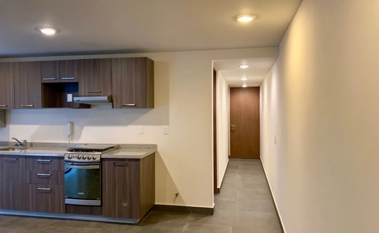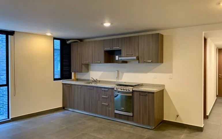 Consta de 2 recámaras, 2 baños completos, área social con cocina abierta integrada y 1 estacionamiento.