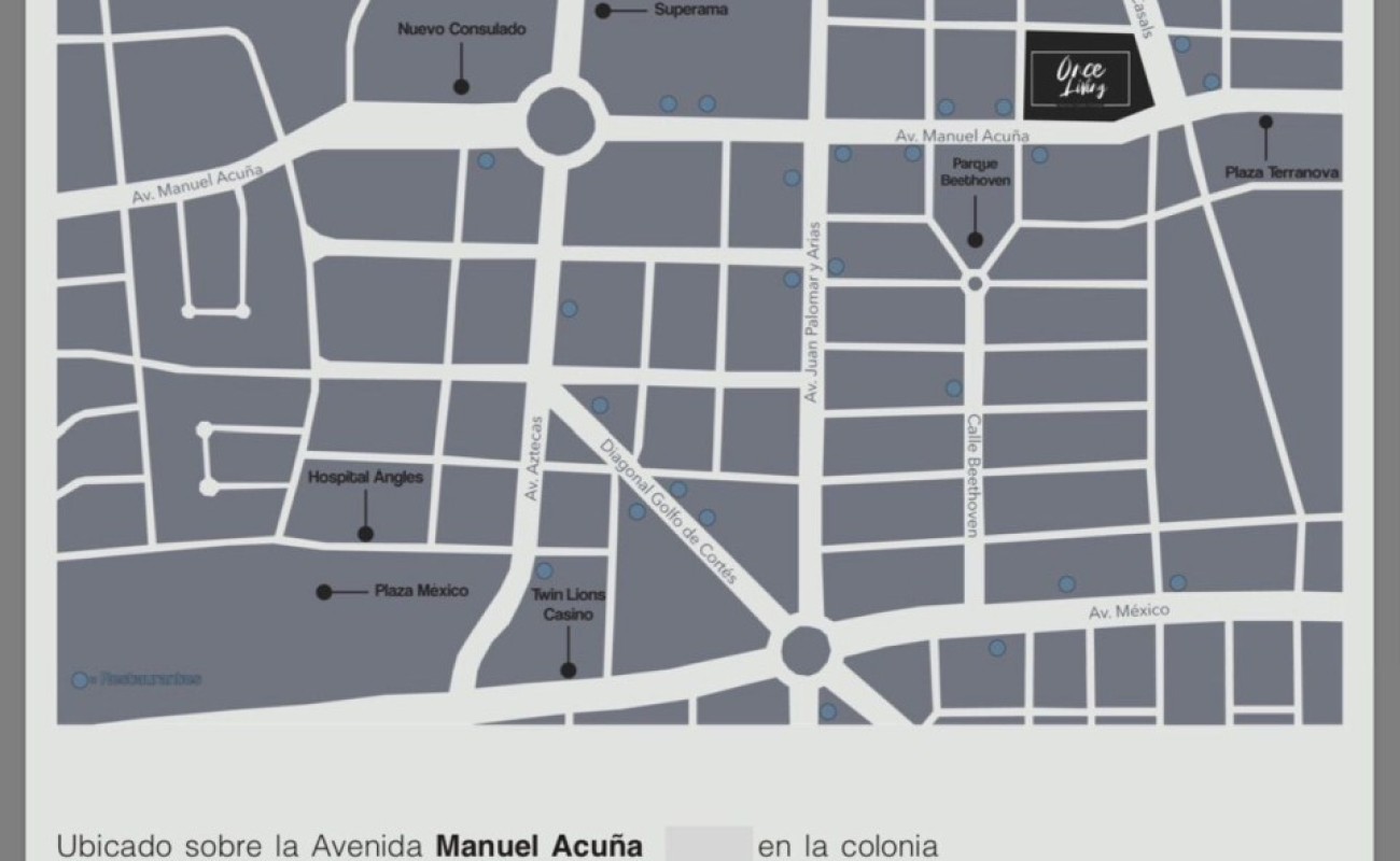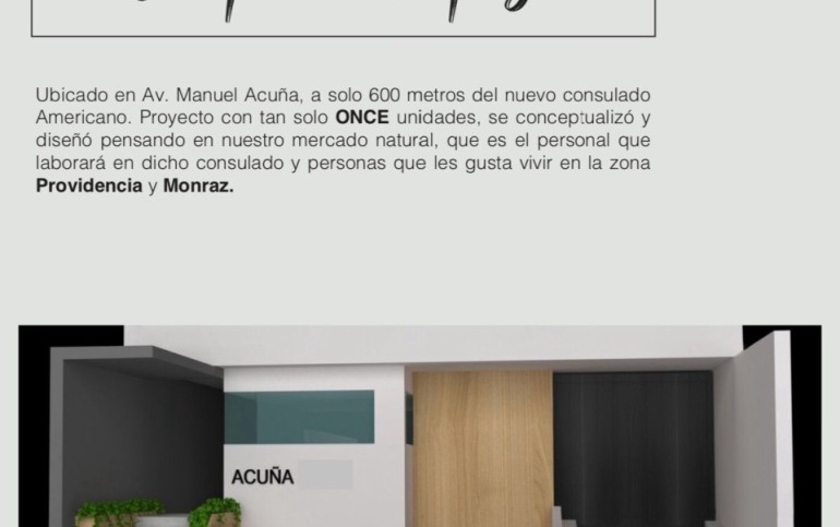 ONCE living es un conjunto exclusivo de 11 departamentos, ubicado sobre la Av. Manuel Acuña a unos pasos del nuevo consulado de los Estados Unidos, el cual se conceptualizó y diseñó pensando en nuestro mercado natural, que es el personal que labora en dicho consulado y personas que les gusta vivir en la zona Providencia y Monraz, cumpliendo con poco más de 40 requisitos que el consulado exige para que su personal pueda habitarlos con seguridad y confort de máxima calidad.