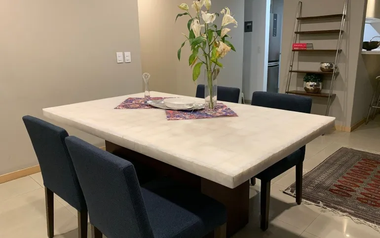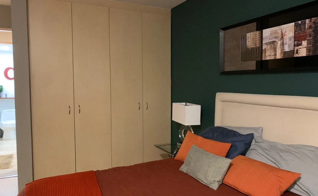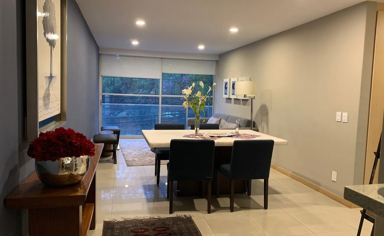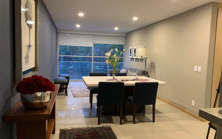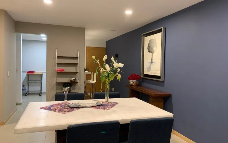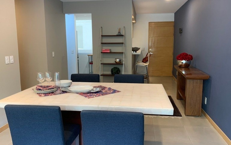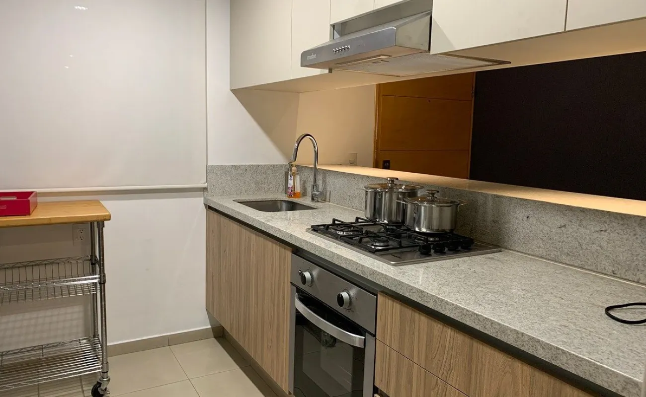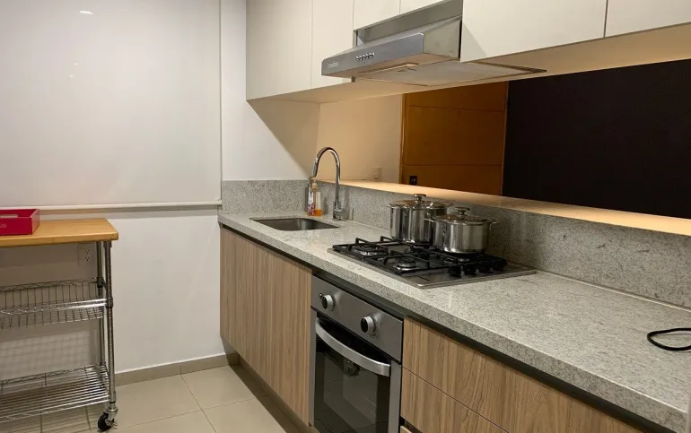 Estupendo Depto amueblado y equipado para entrar, con superficie de 107m y 3 recamaras, la principal con su baño closet, y las otras dos con closet cocina renovada semiabierta, con electrodomésticos y 2 autos en fila y además una bodega en garage bastante grande. piso 2 exterior.