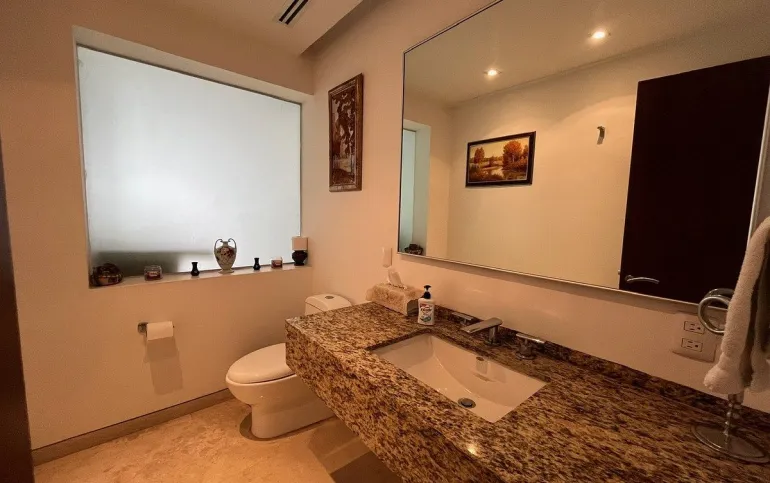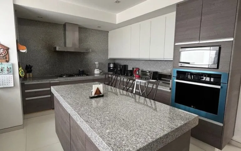 Con la misma distribución y amplitud, esta residencia ofrece además un espectacular roof garden privado, equipado con dos pérgolas, deck de madera y 1/ 2 baño, perfecto para entretenimiento al aire libre y reuniones sociales de alto nivel. También cuenta con 3 recámaras con baño, área de lavandería, 2 cuartos de servicio con baño, bodega y 4 estacionamientos.