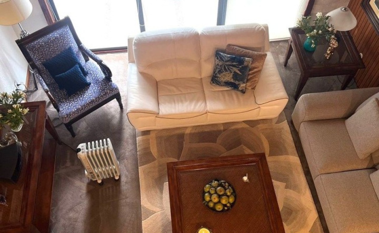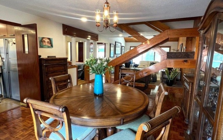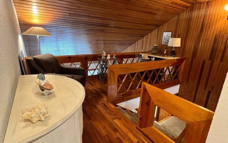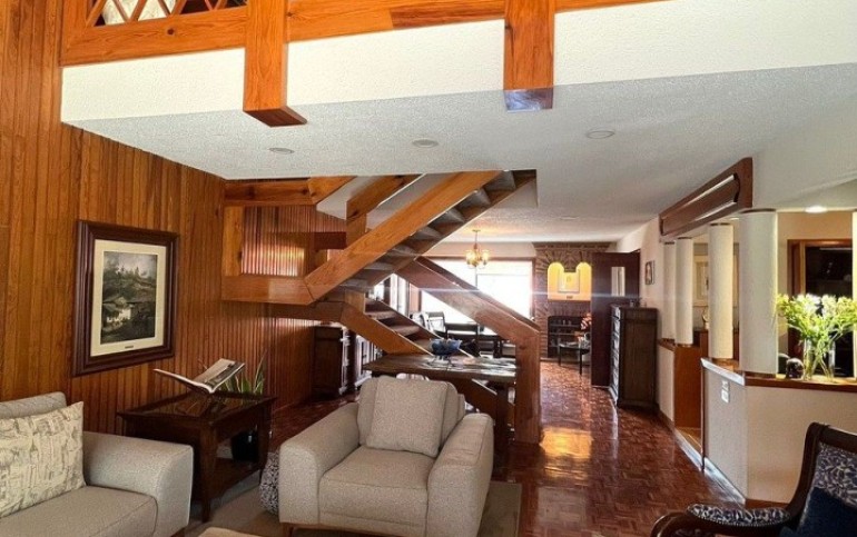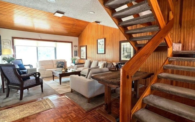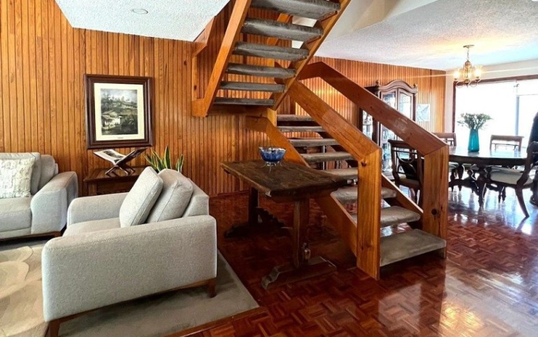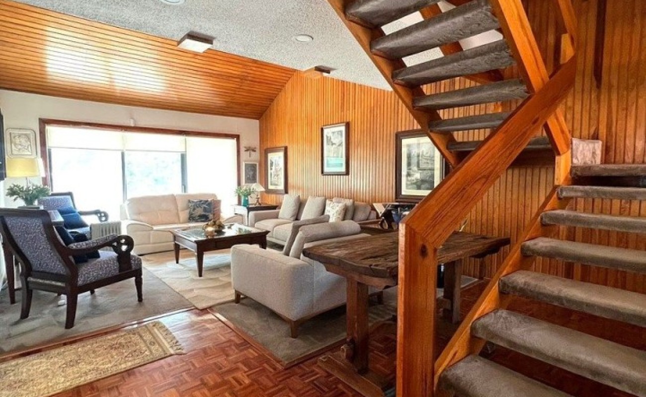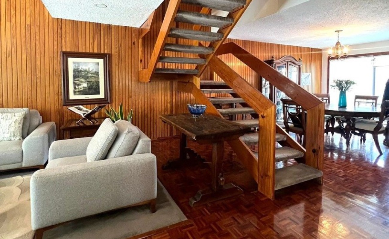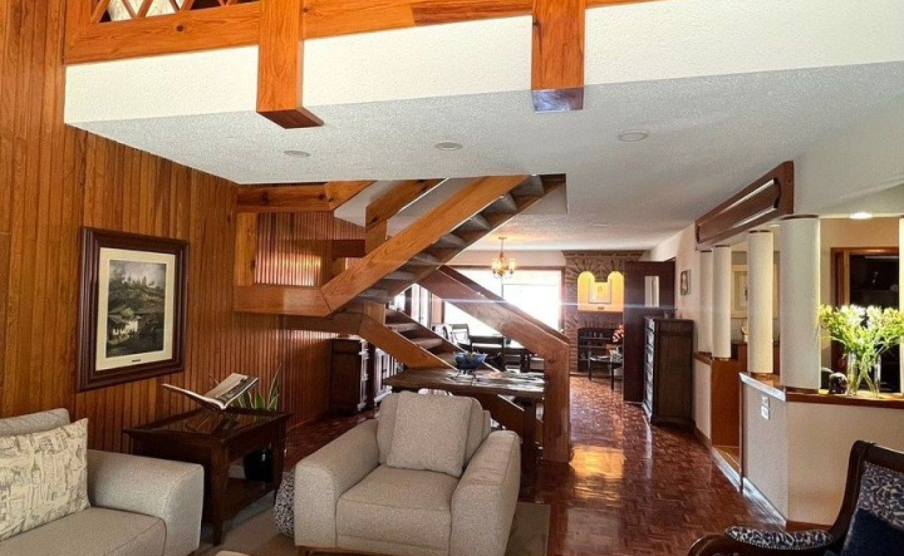 Planta Baja, Terraza, patio con fuente, estancia de doble altura con techos inclinados de madera, piso de parquet, comedor, bar, baño de visitas, oficina o estudio, cocina. Área de lavado, cuarto de servicio con baño completo.