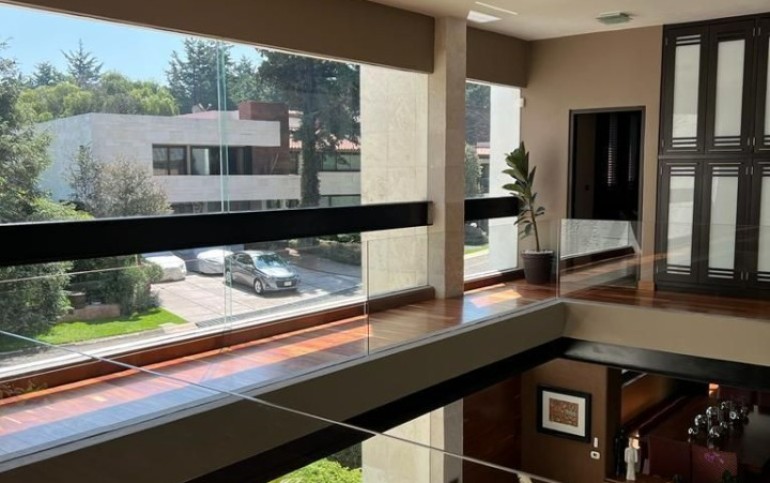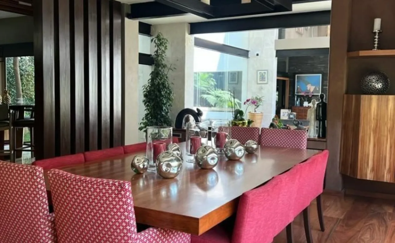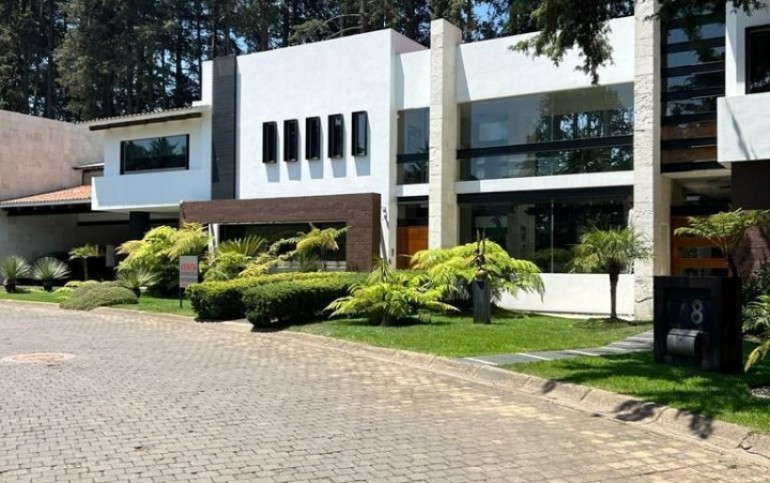 Estancia principal con doble altura, ventanales con vista boscosa, comedor, cava subterránea, terraza, dos chimeneas de gas, cocina equipada, desayunador, sala de TV, dos despachos, baño de visitas, acabados de lujo.