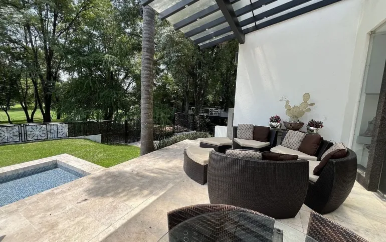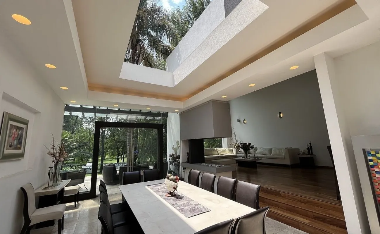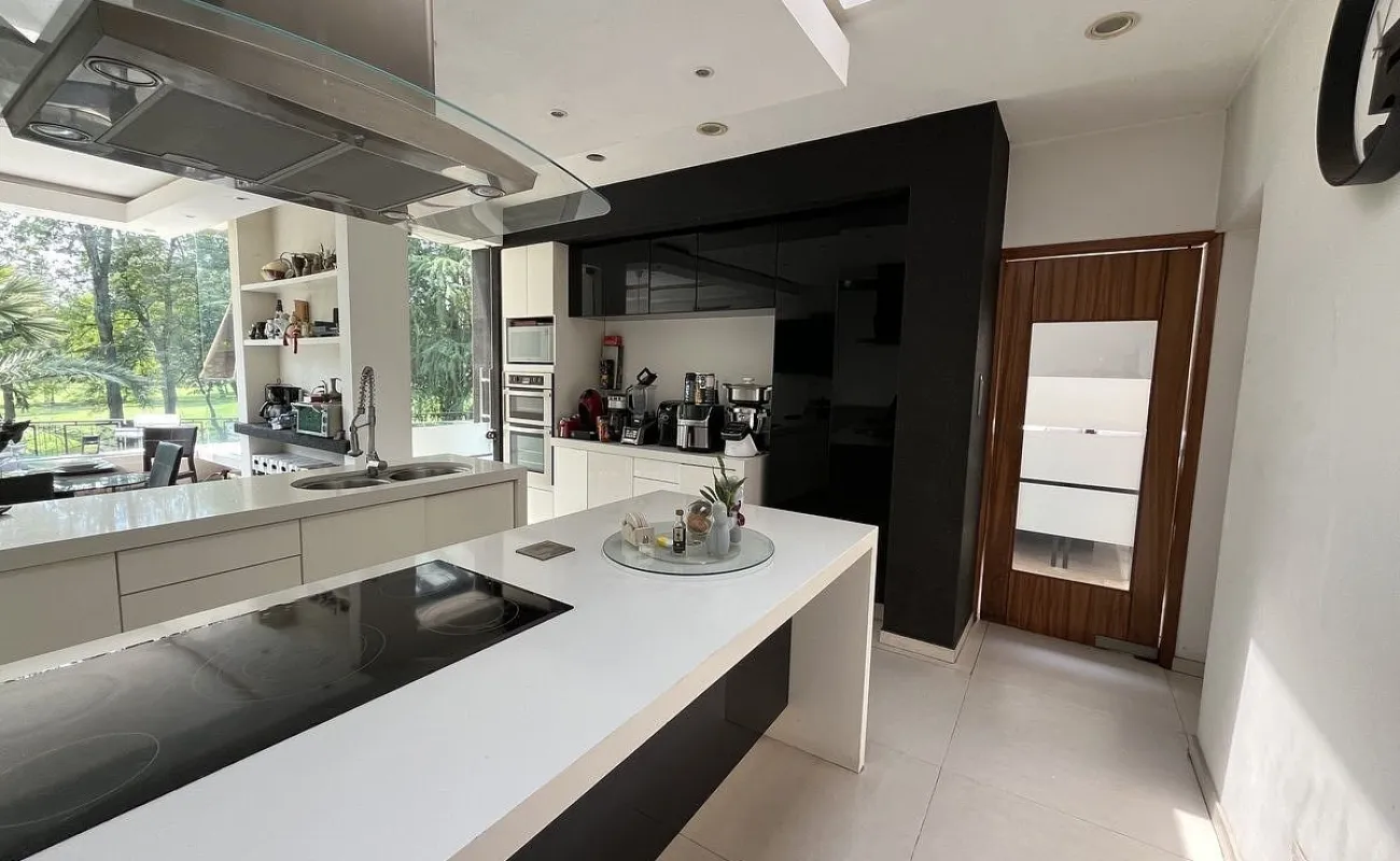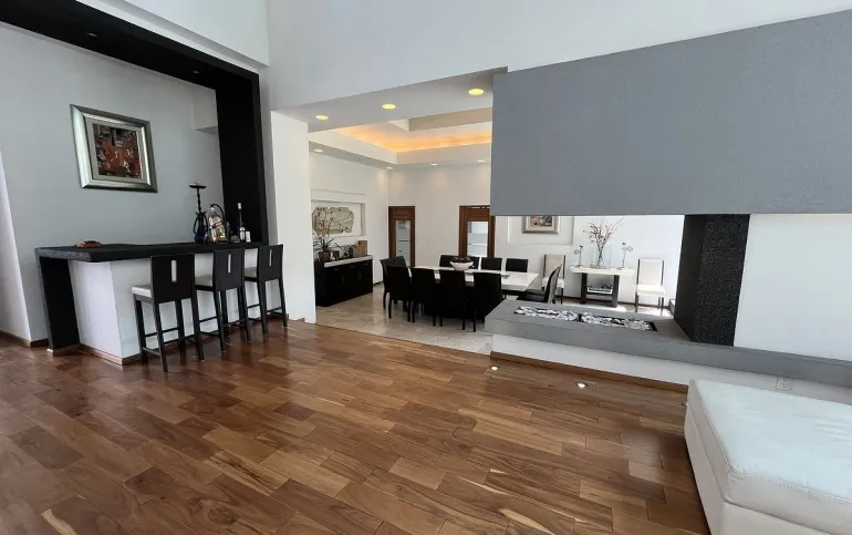 Entrando se encuentra medio baño de visitas, bar , amplísimo espacio para sala y comedor con un hermoso ventanal que da al jardín y al campo de golf, chimenea de etanol y el comedor con techo corredizo para abrir el espacio al aire libre. Linda y equipada cocina moderna, antecomedor y una 2a cocina de apoyo además de enorme despensa. La recámara principal está un piso arriba y cuenta con sala de TV, enorme terraza con gran vista, baño completo y vestidor, todas las persianas de la casa son eléctricas.